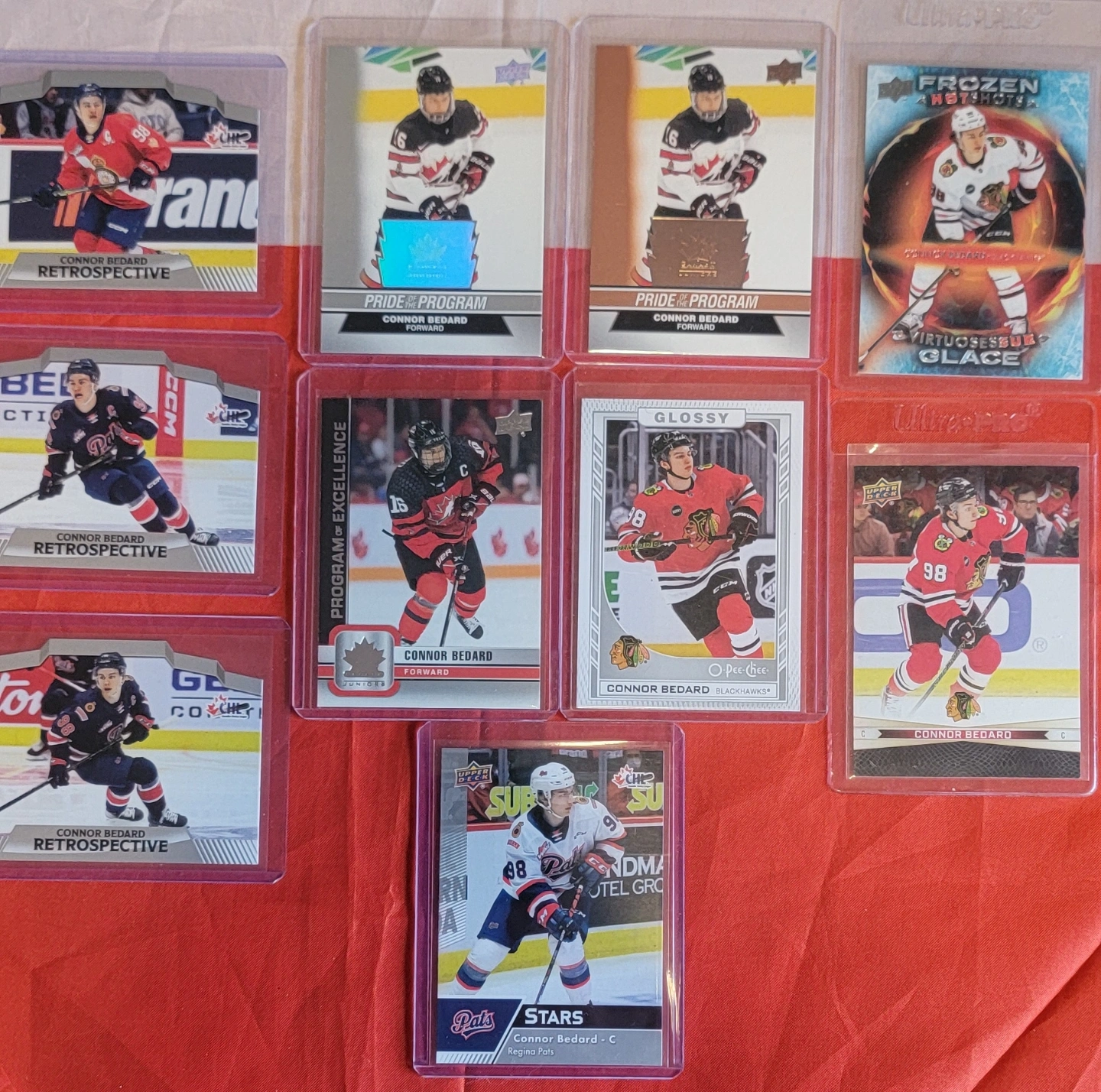 Collection of Connor Bedard hockey cards. Includes various brands and sets. Great for collectors.