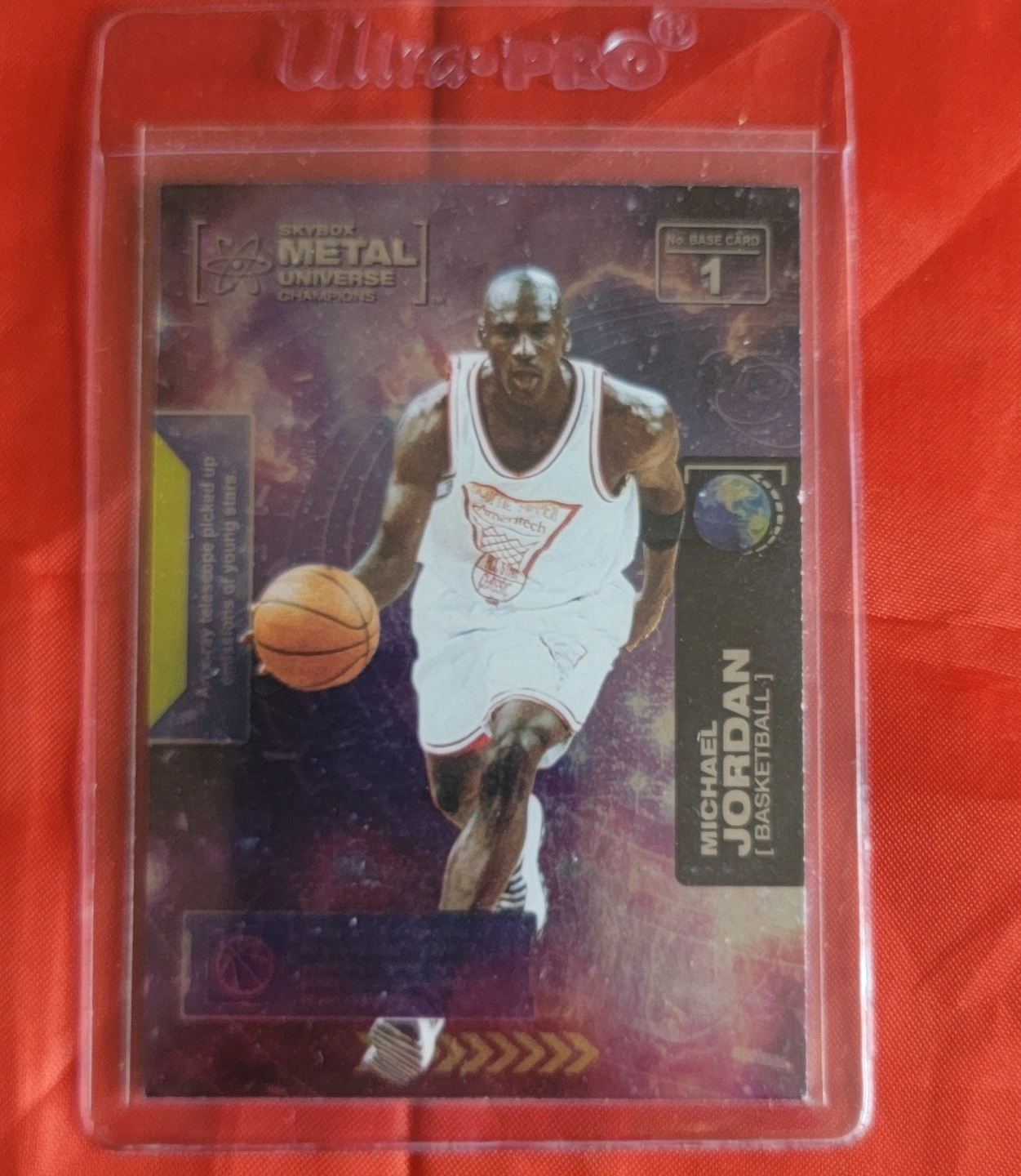 Michael Jordan rookie card. Skybox Metal Universe Champions series. Numbered #1. In a protective case.