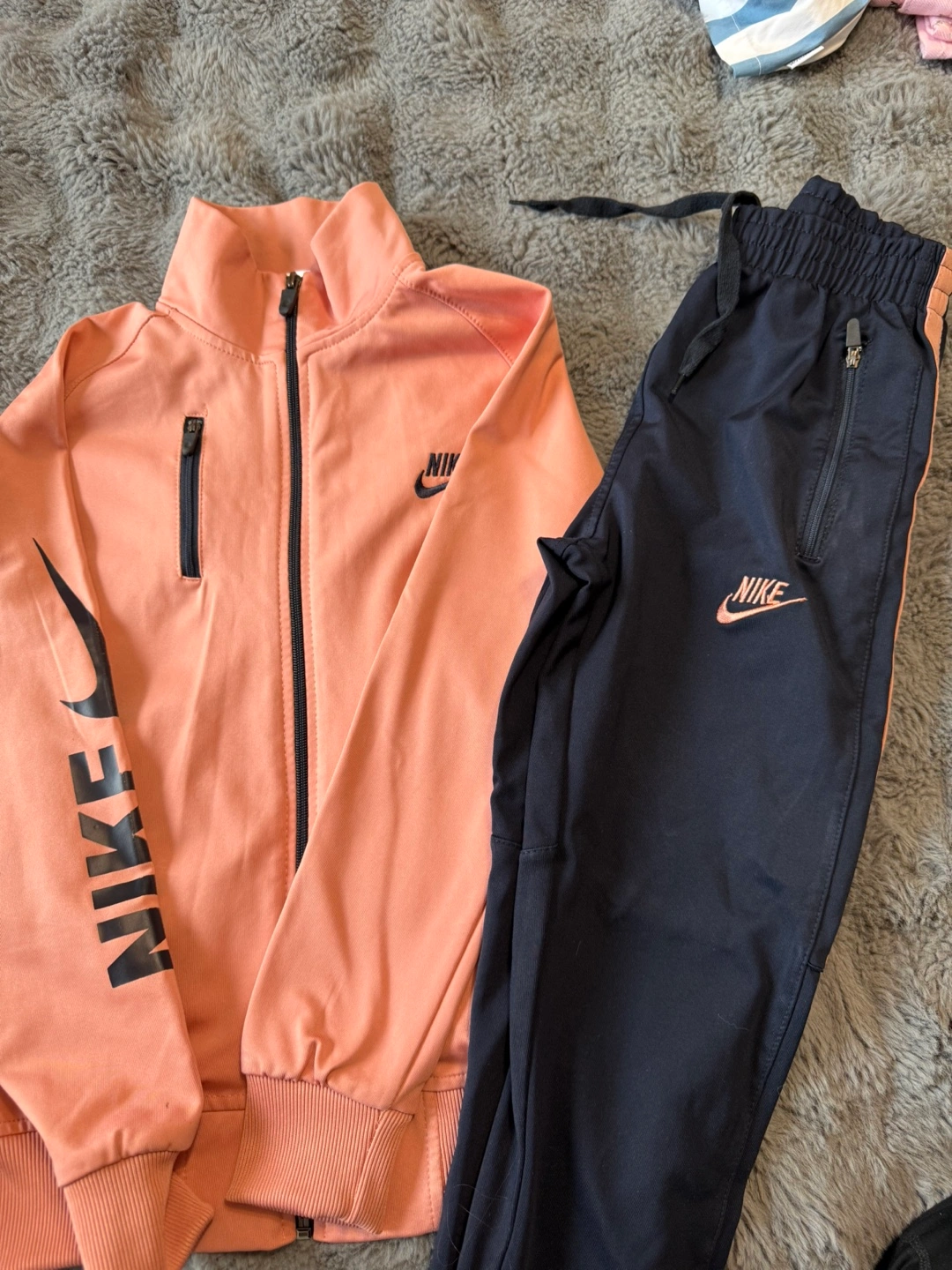 Youth large Nike tracksuit. Peach coloured zip-up jacket and black joggers. Both pieces feature Nike branding. Side pockets on both jacket and pants. Elastic waistband on joggers.