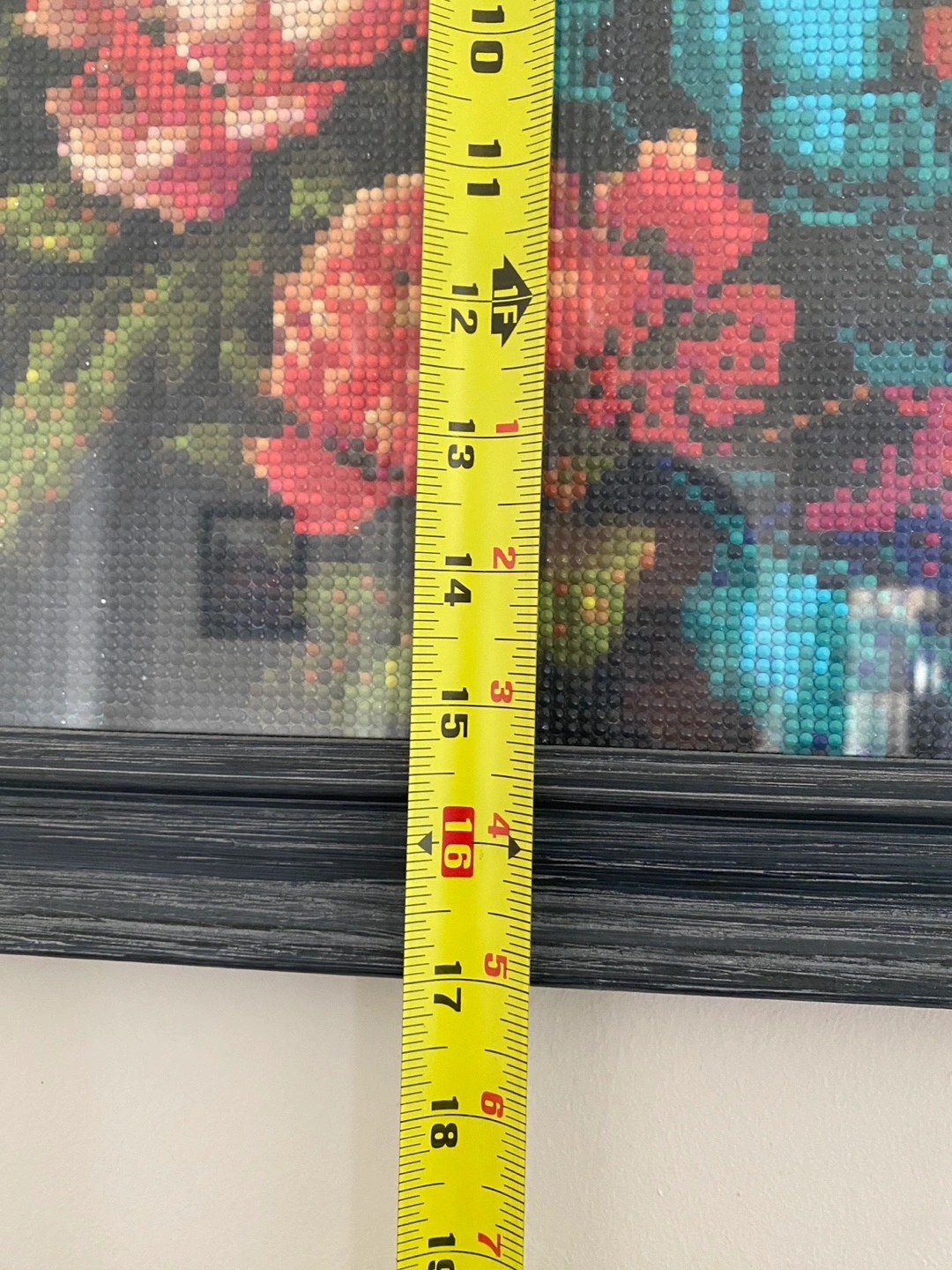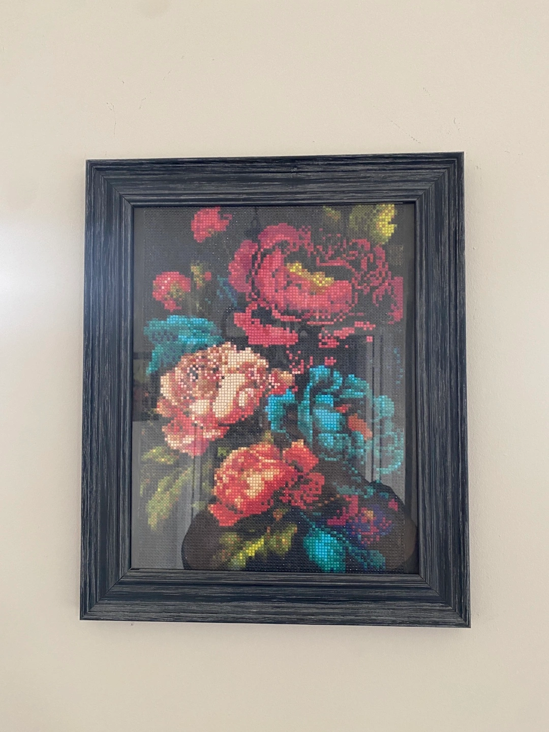 Adorn your living space with this charming framed diamond painting, showcasing a vibrant floral bouquet. The artwork features a variety of jewel-toned flowers set against a dark background, all meticulously crafted with diamond beads for a textured, eye-catching effect. This piece is in good condition and ready to hang, adding a touch of sparkle and colour to any room.