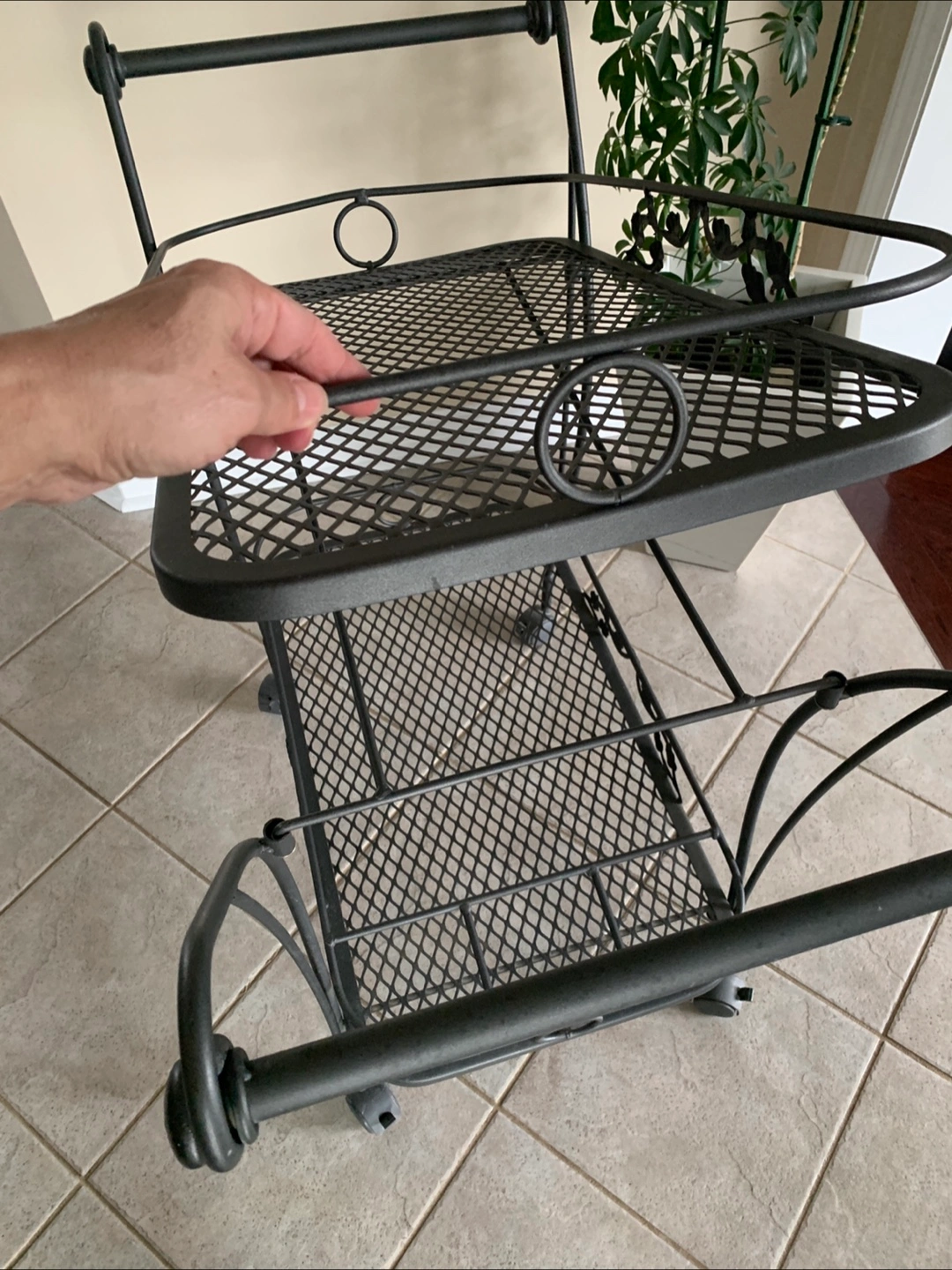 Excellent condition! Larger than most with wheels that roll perfectly. Wine bottle storage on the front and a removable tray on top.