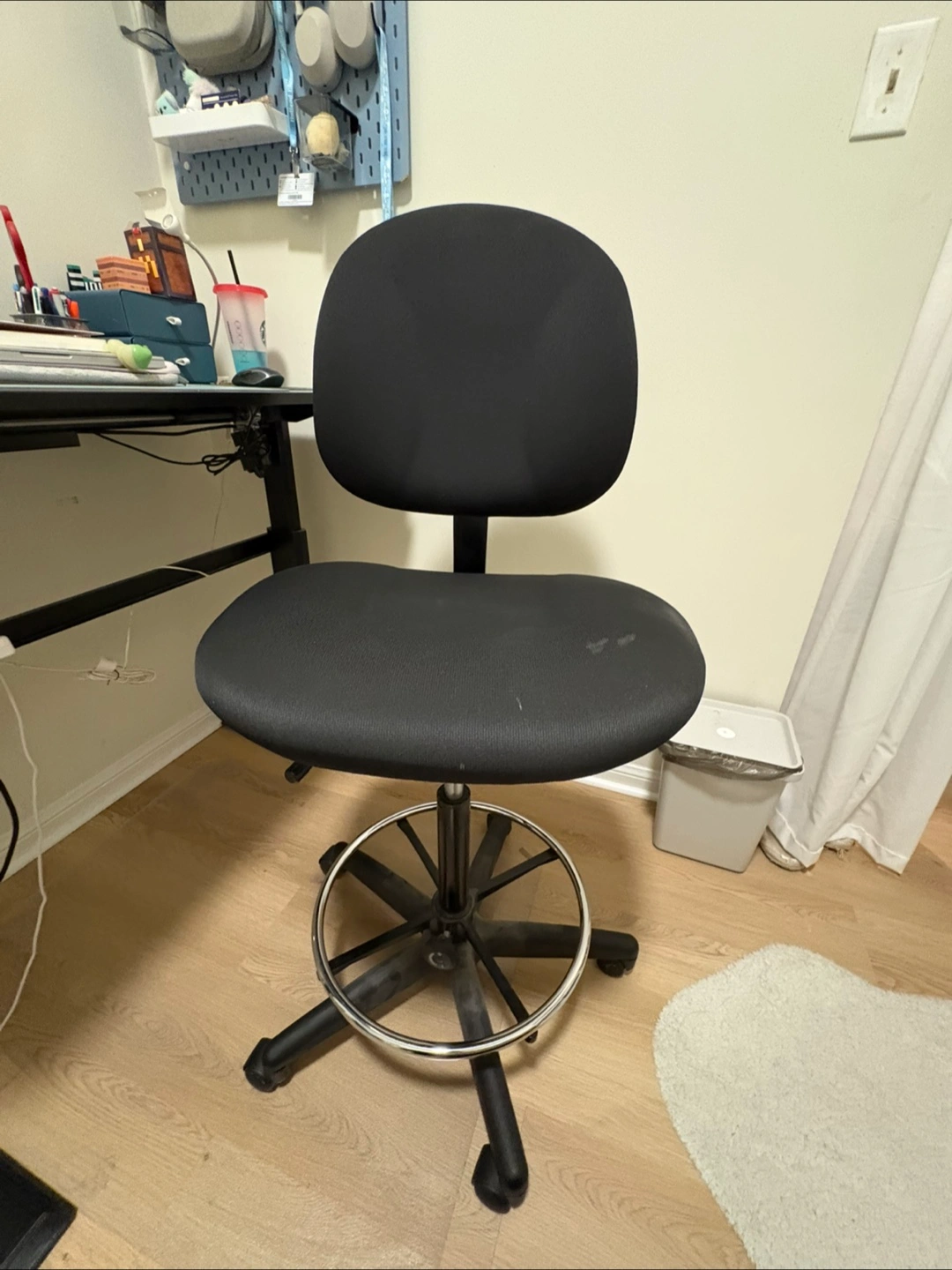 Adjustable height drafting chair. Black fabric seat and back. Chrome ring footrest. Five-star base with casters. Minor wear. Pick up ASAP.