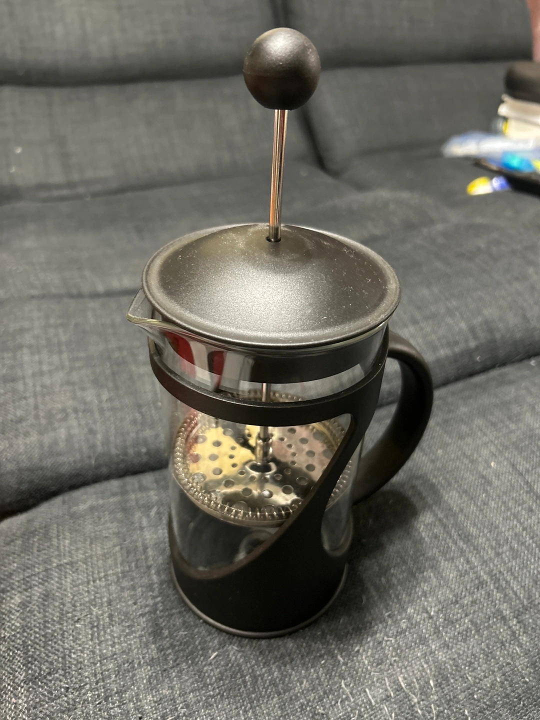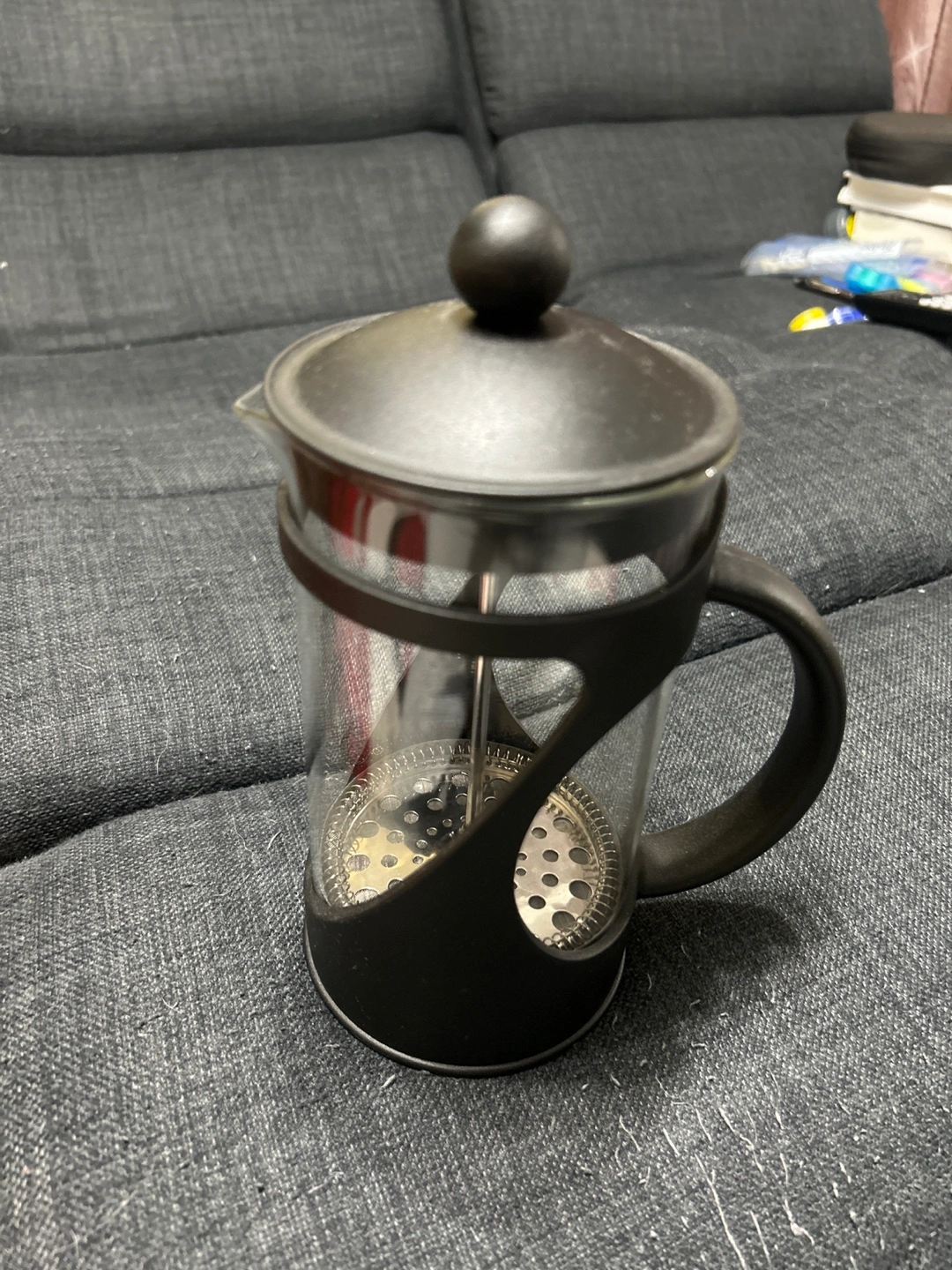 Black and clear glass French press. Good for making coffee or tea. Includes a filter and plunger. Stylish design, easy to use and clean.