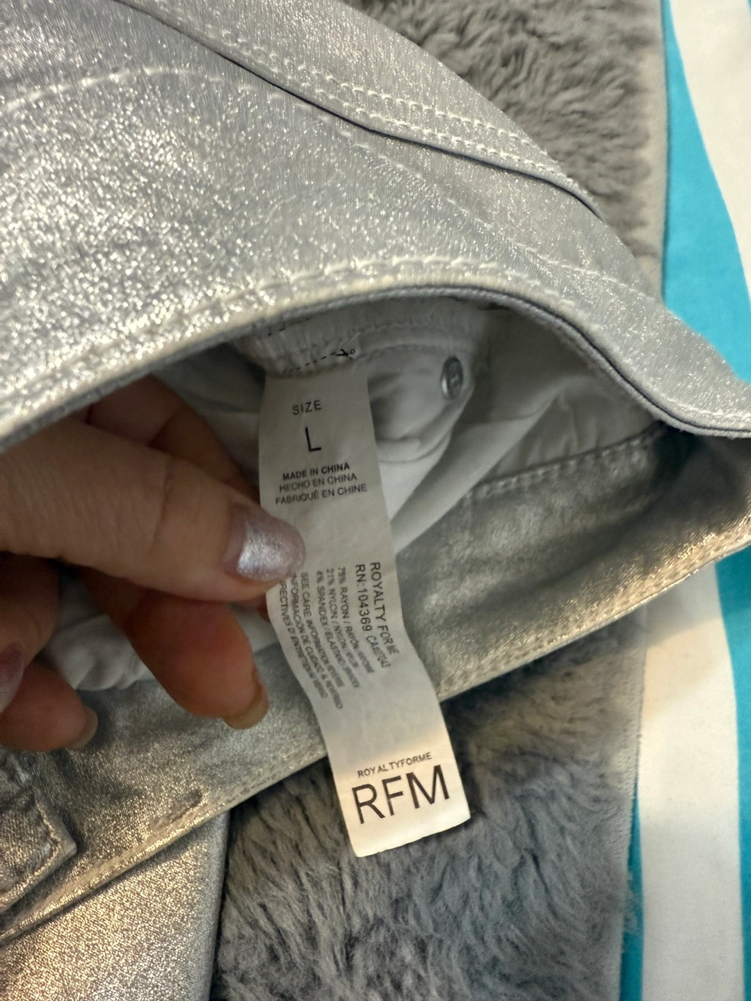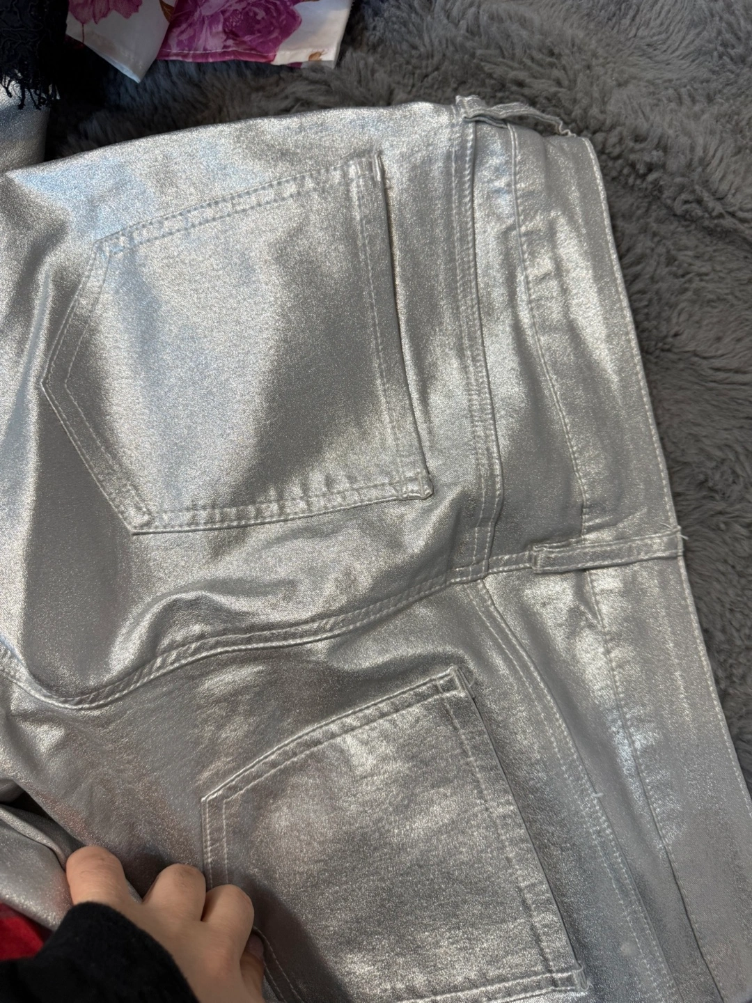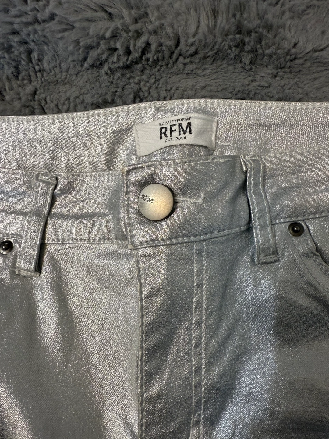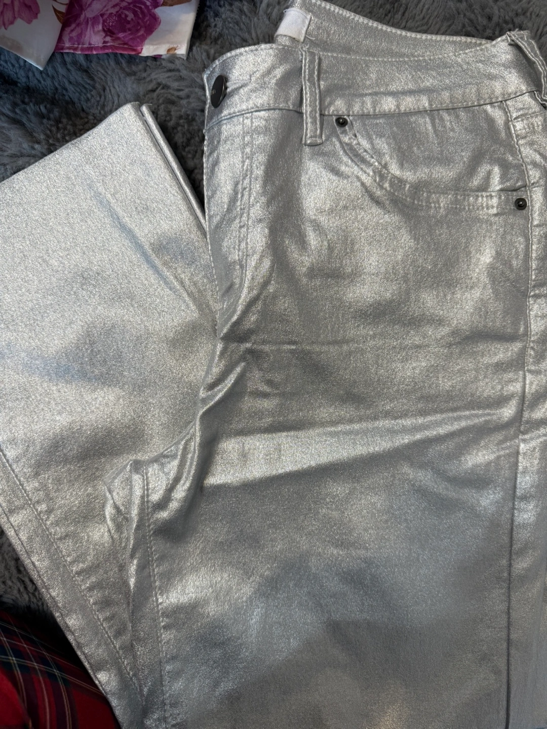 157Metallic silver jeans. Size large. Good condition. Straight leg. Five-pocket style.