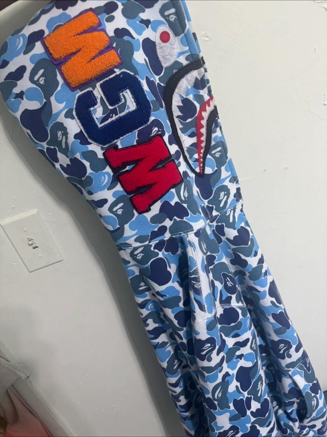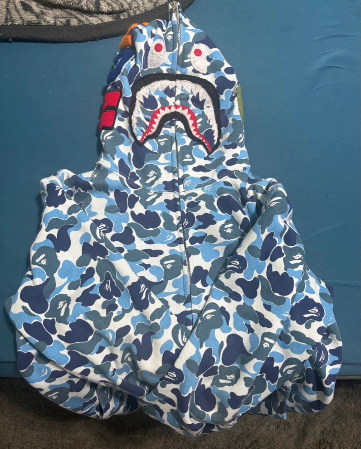 Men's Bape shark camo zip-up hoodie. Blue camo pattern. Features large shark and Bape logo on hood. Full zip closure. Long sleeves. Excellent condition.