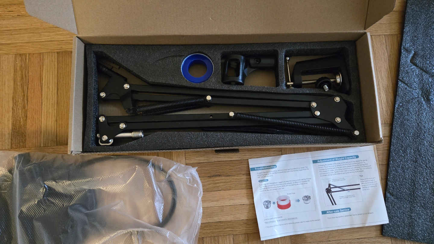 108Like new, in box. Microphone scissor arm stand. Black metal construction. Includes mounting hardware and instructions. Durable and stable. Pickup only in Roosevelt Island. Cash payment only.
