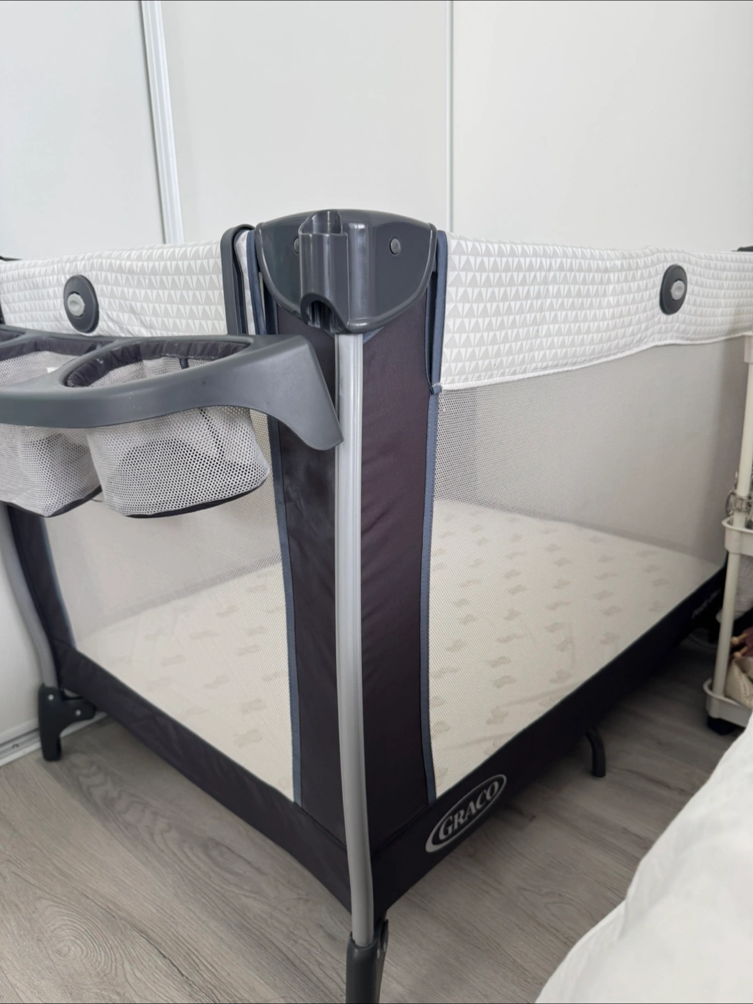 Portable playard/portable crib, easy to set up and fold. Grey and black colour. Includes bassinet and changing station (already dissembled, not in pictures). Great for travel or home use.