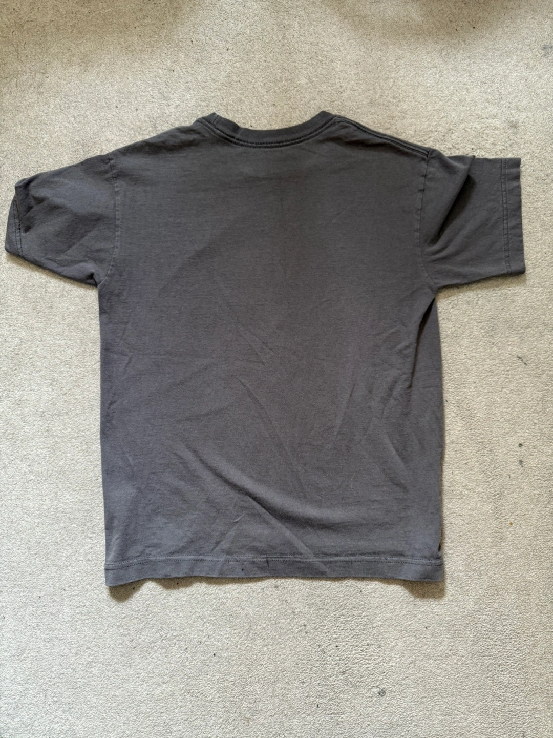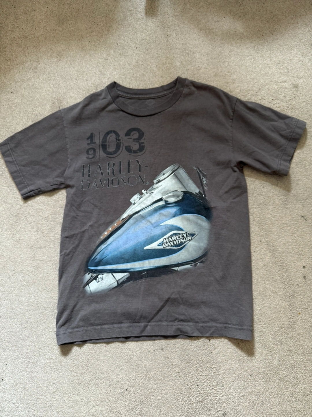 Grey short sleeve t-shirt. Features a graphic of a Harley-Davidson fuel tank. Youth size Large or Men’s Small