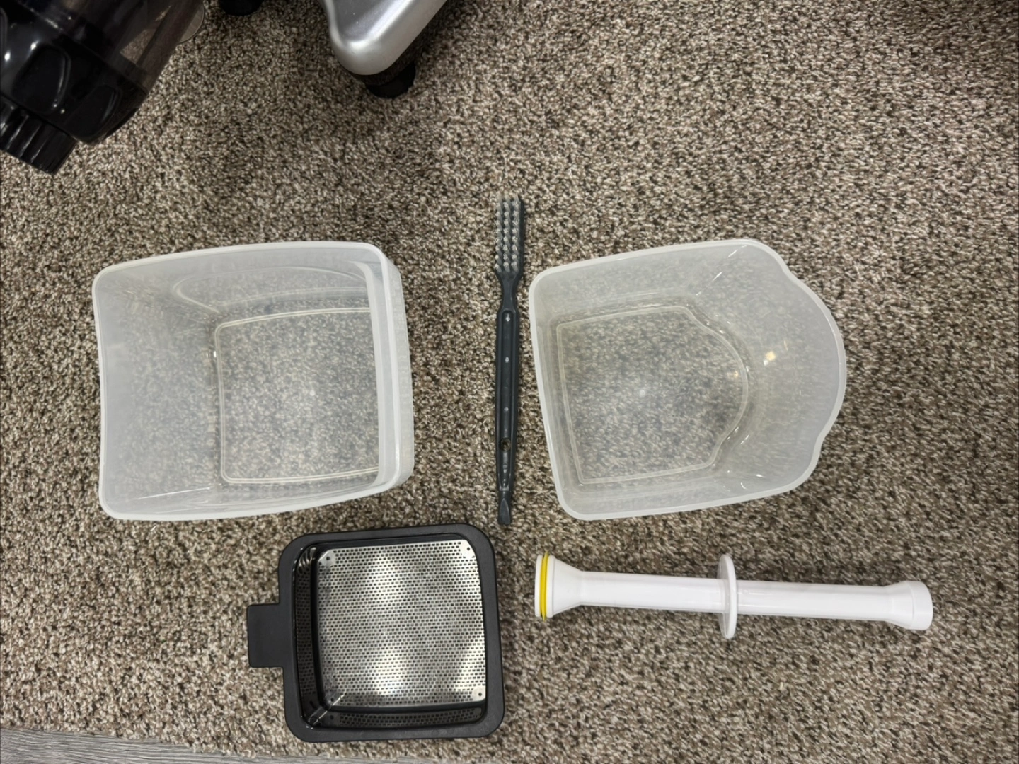 Omega juicer and food processor. Includes multiple containers and cleaning brush. Silver and black. Excellent condition.