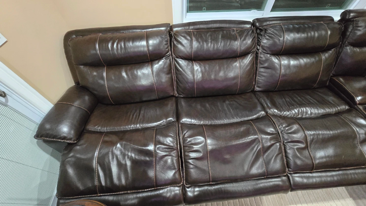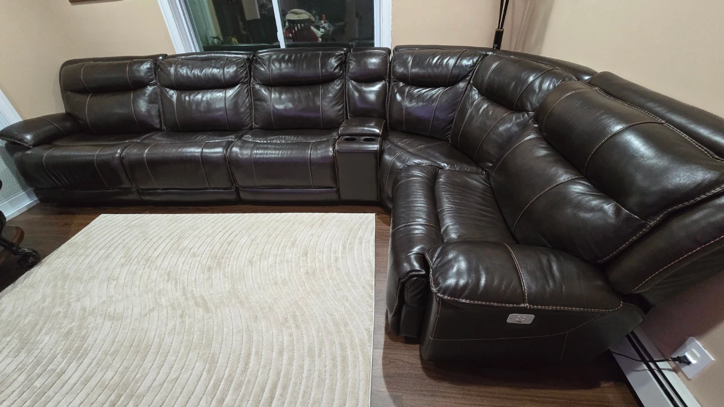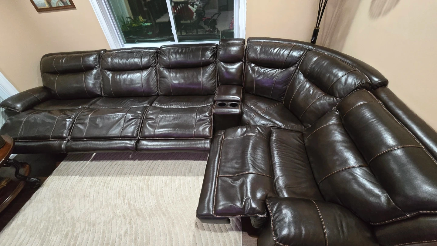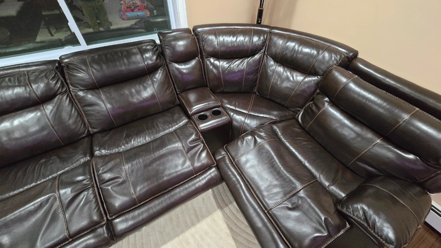 Selling a comfortable brown leather sectional sofa. It features reclining seats for ultimate relaxation. The sofa also includes a convenient center console with cupholders and 4 USB charging. It's in good condition and ready for a new home!