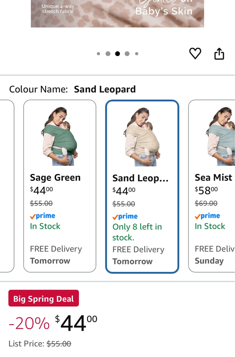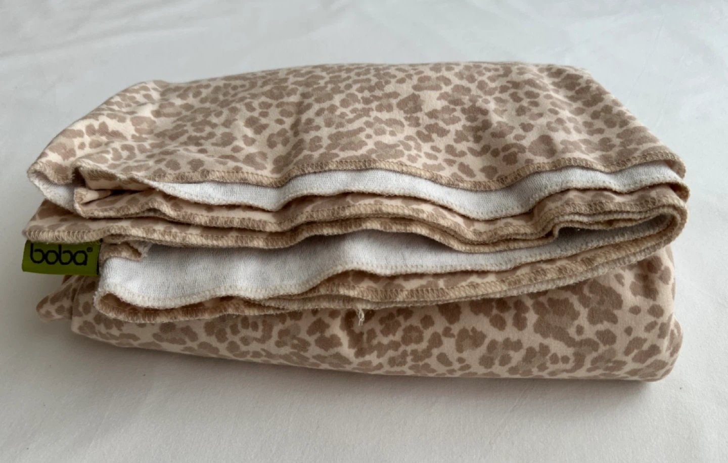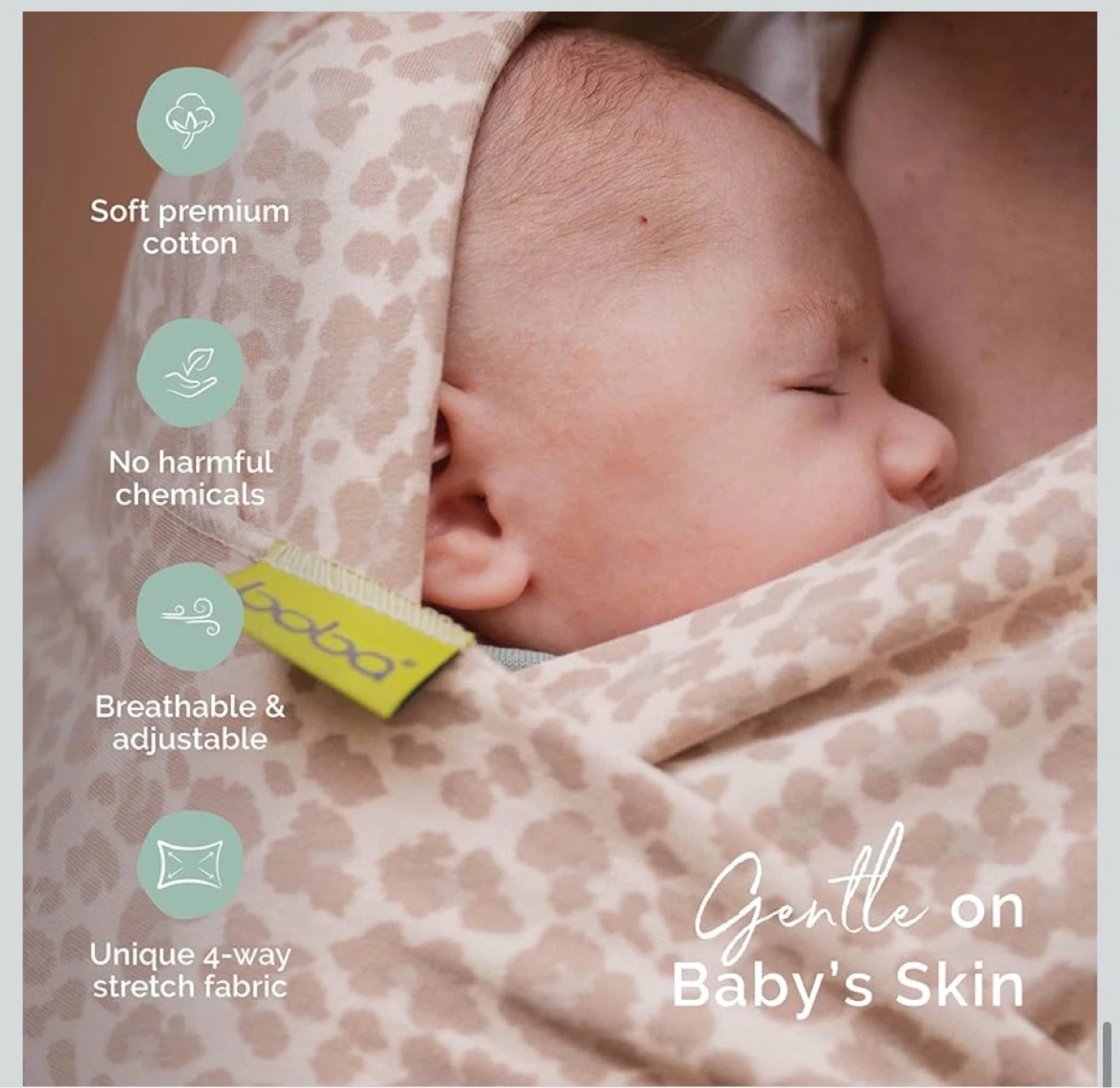 Boba baby wrap carrier in Sand Leopard print. Made from soft, premium cotton with 4-way stretch fabric. Breathable and adjustable for comfort. Gentle on baby's skin and postpartum bodies. Good for newborn, skin to skin time.
