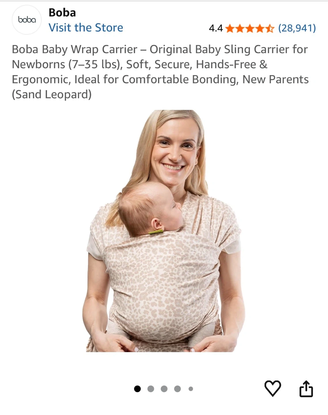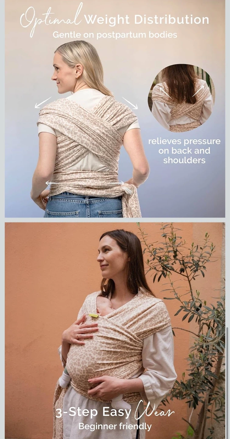Boba baby wrap carrier in Sand Leopard print. Made from soft, premium cotton with 4-way stretch fabric. Breathable and adjustable for comfort. Gentle on baby's skin and postpartum bodies. Good for newborn, skin to skin time.