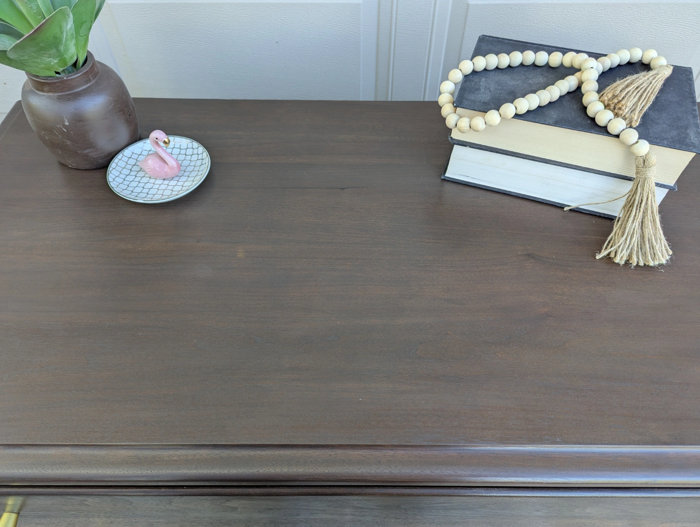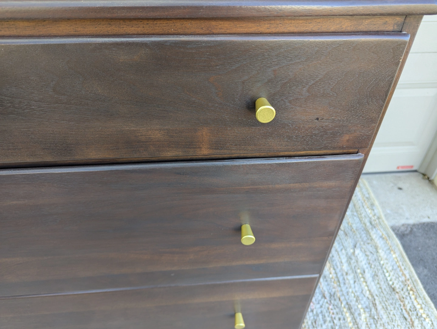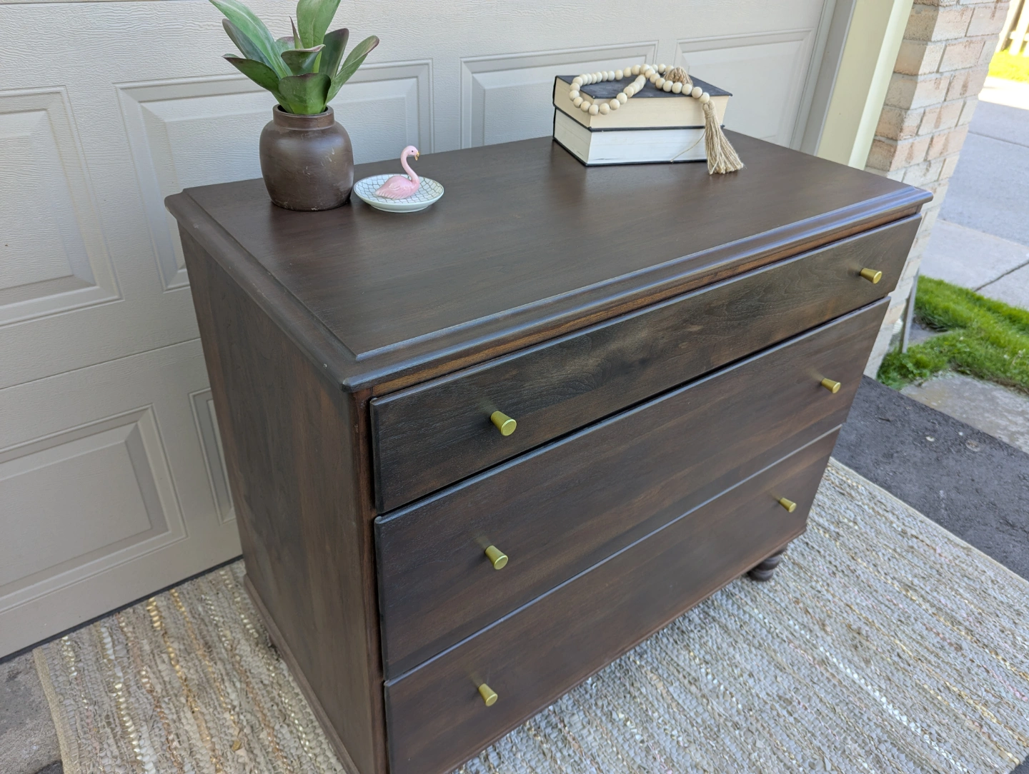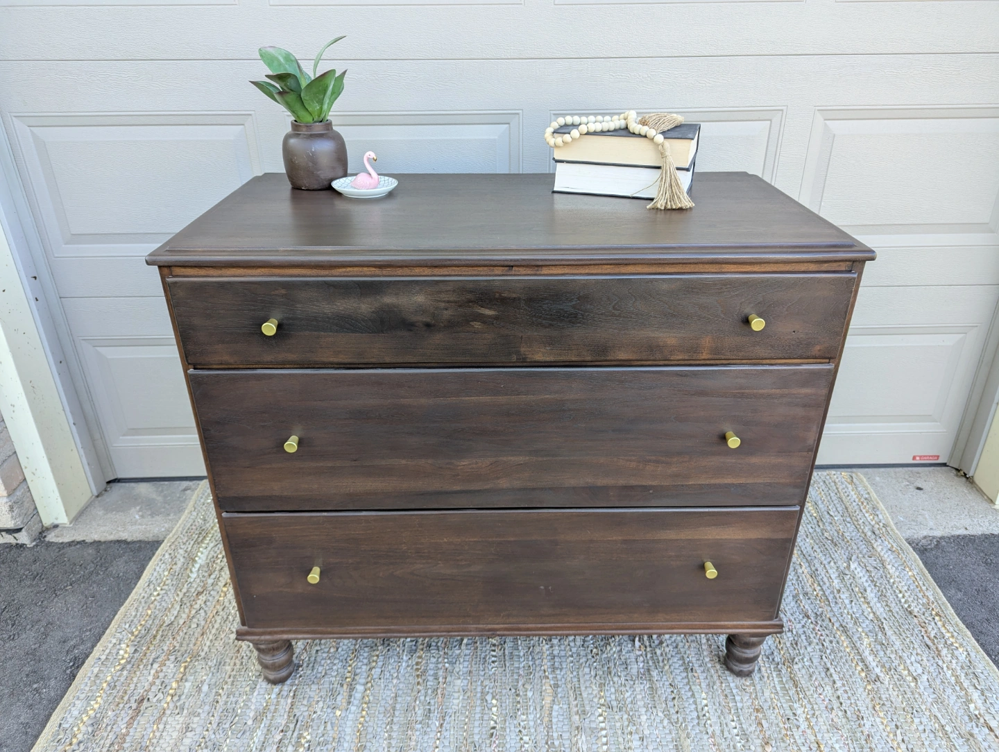 Newly refinished solid wood dresser with three large, dovetailed drawers. Stained in a dark grey brown with new gold hardware added.