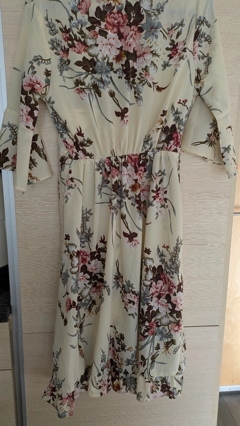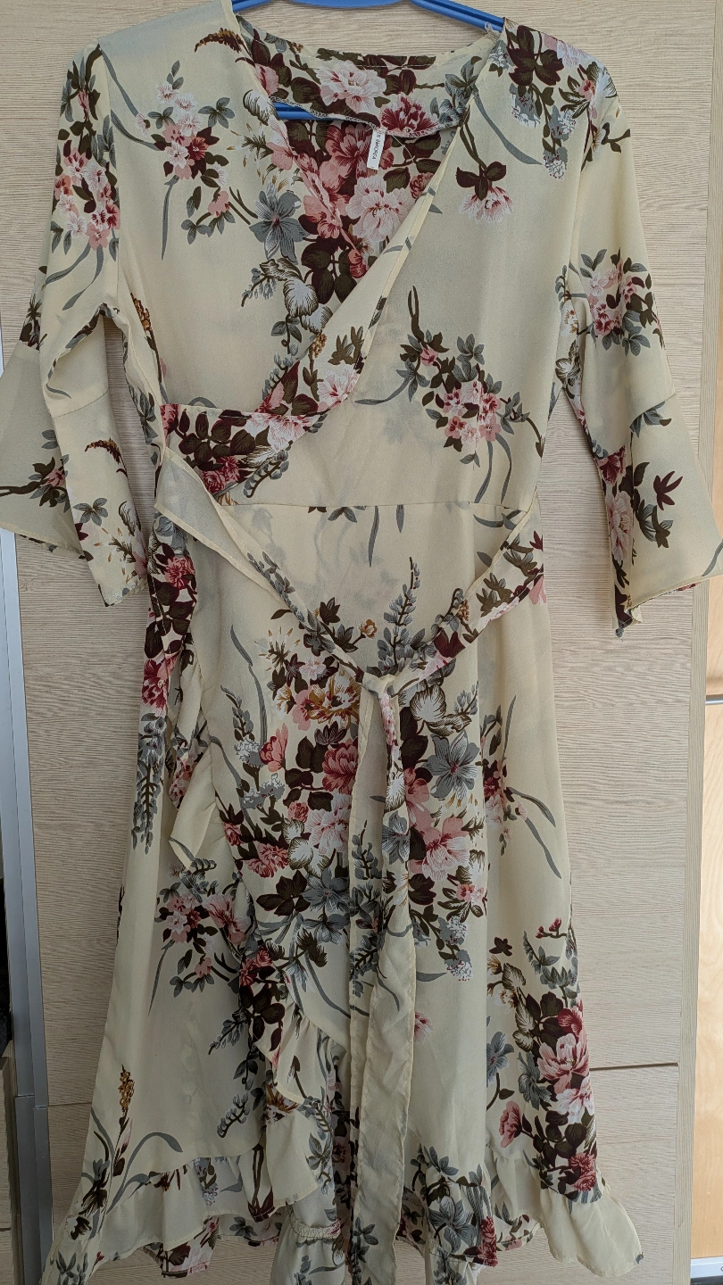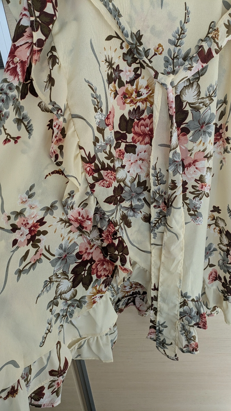 Features a wrap design and three-quarter sleeves. Lightweight and flowy fabric. Perfect for spring or summer.