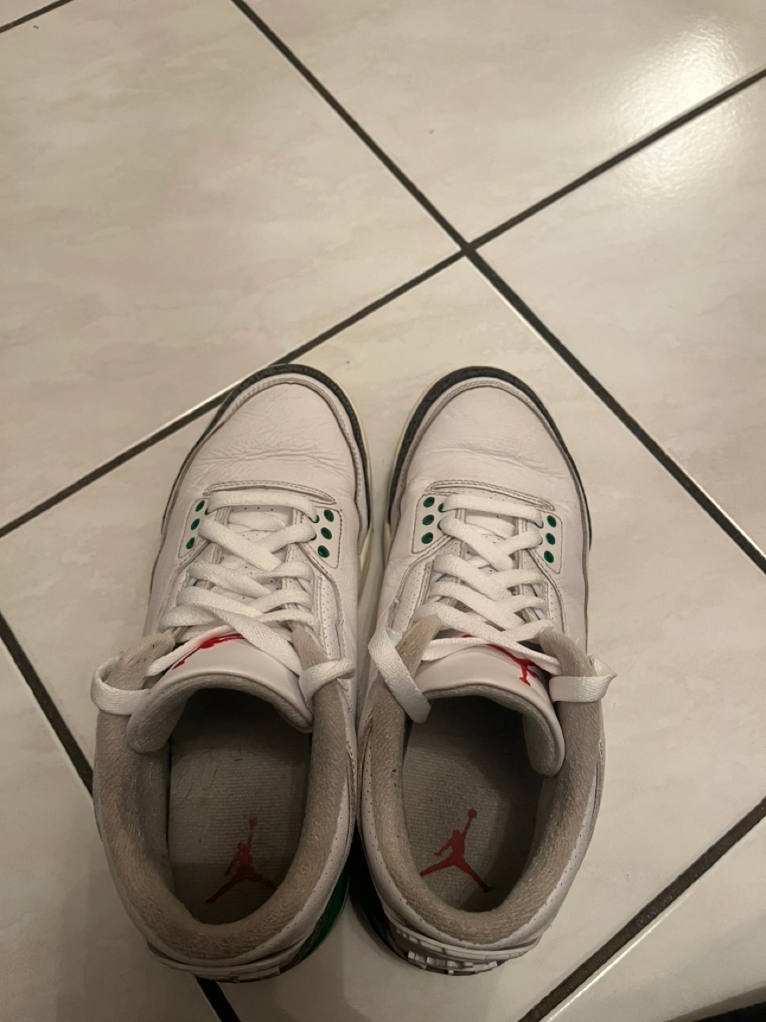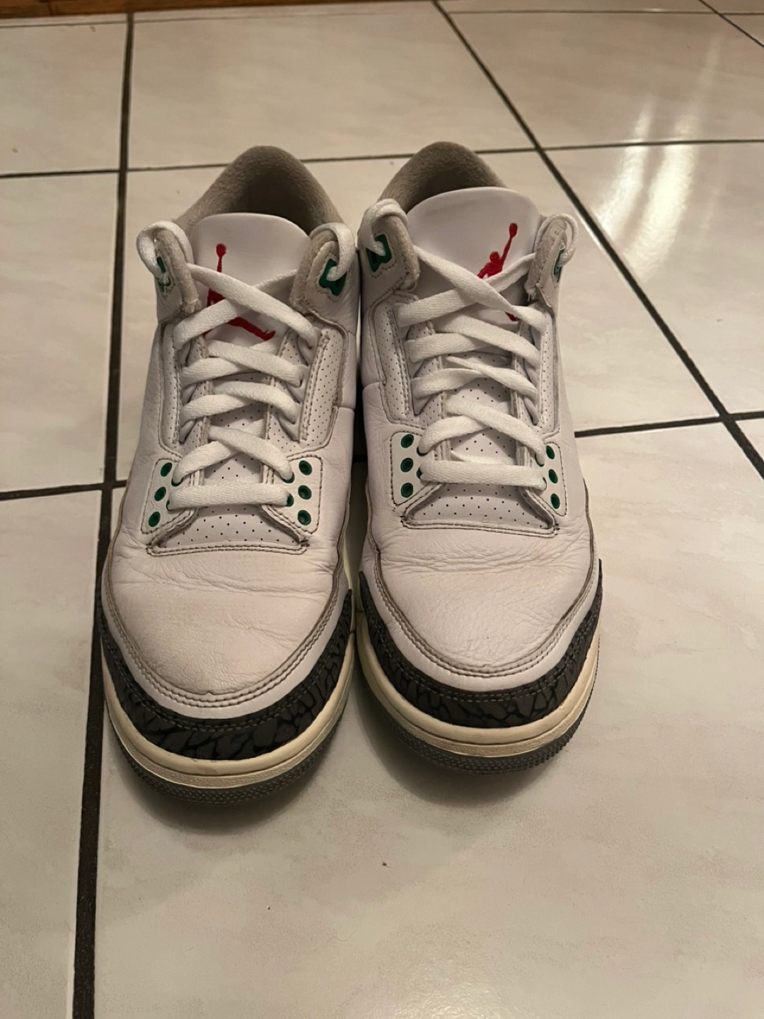 Pre-owned Air Jordan 3 Retro SE sneakers. White leather upper, green accents. Size US 9.5 Some wear and tear.