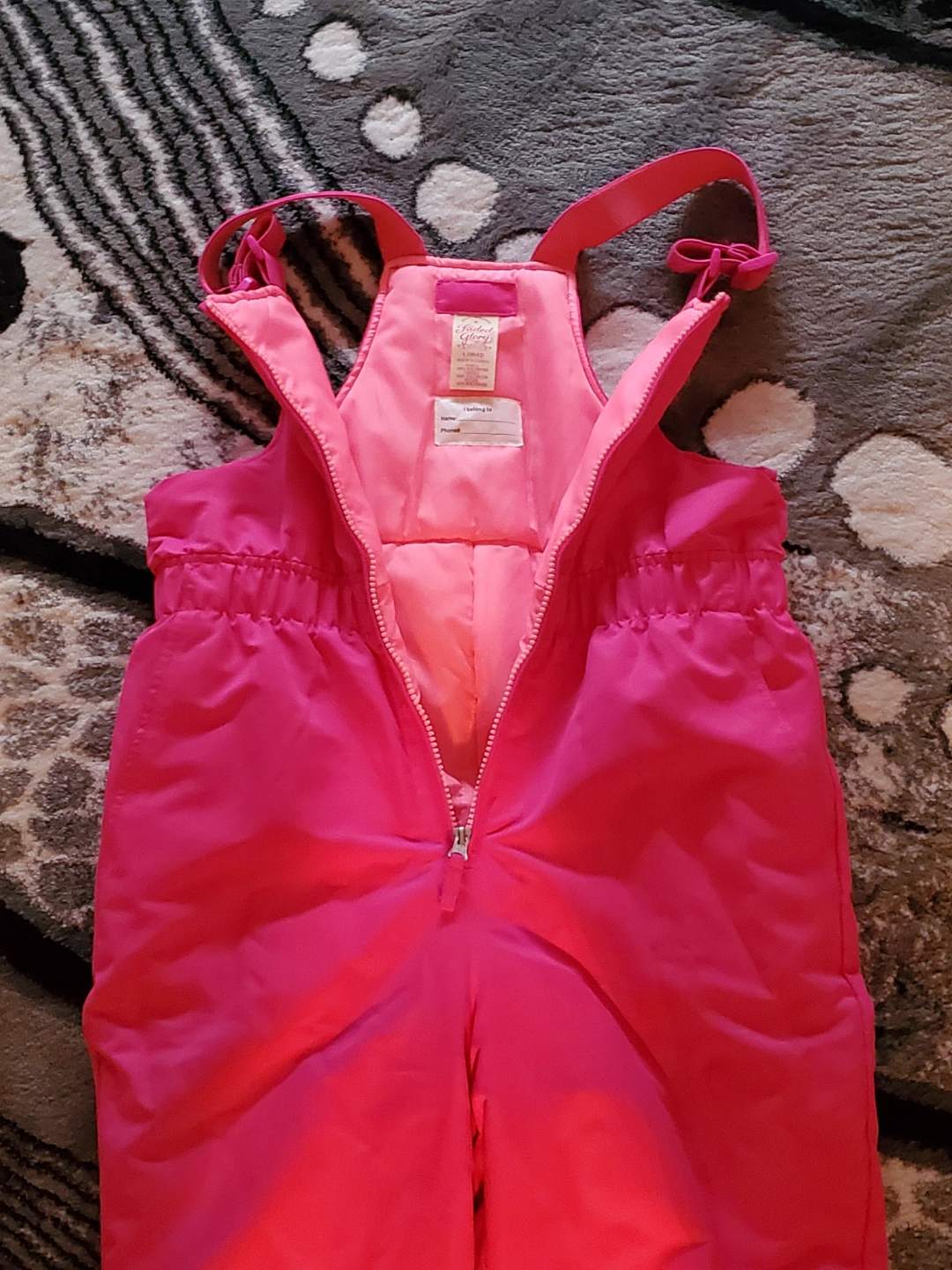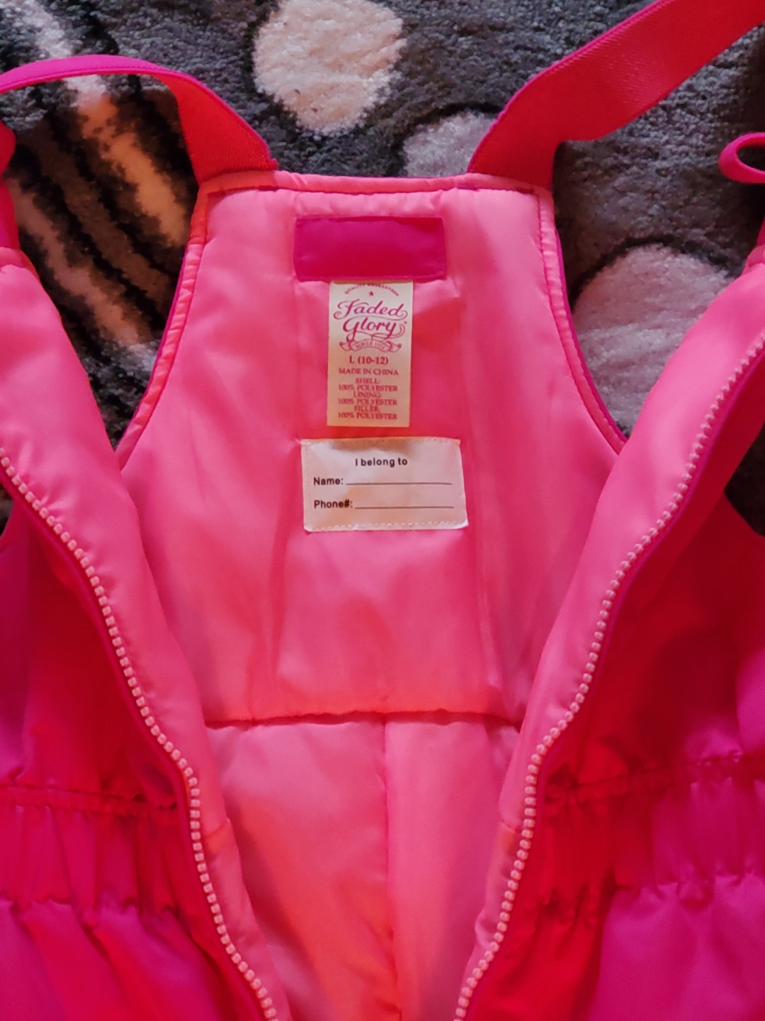 Pink snow pants. Size Large or 10-12. Best suited for individuals who normally wear pants sizes 8-10. Zipper closure. Adjustable straps.