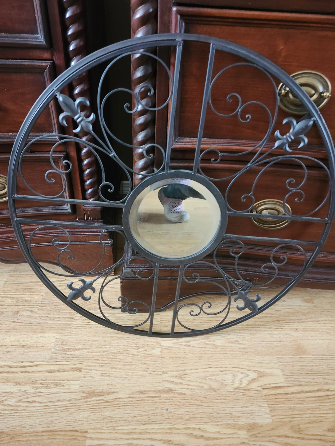 Round mirror in centre with dark brown intricate metal frame. Great for adding a touch of elegance to any room.