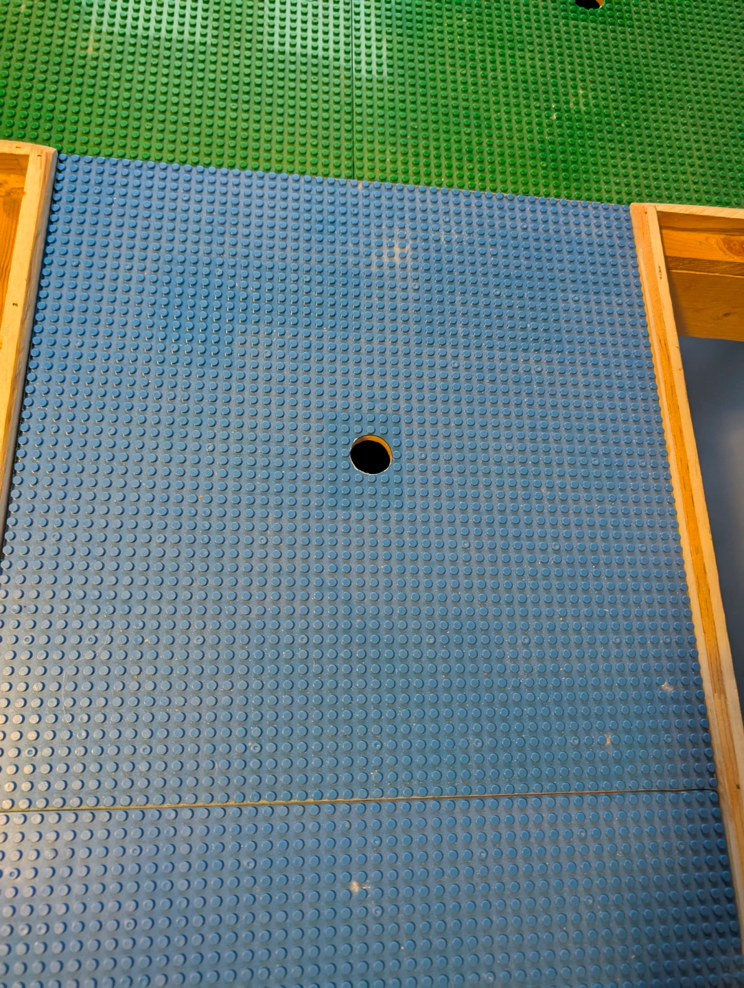 Custom Lego table sturdy frame has custom narrow center inset to allow child to work on all areas of the table at once