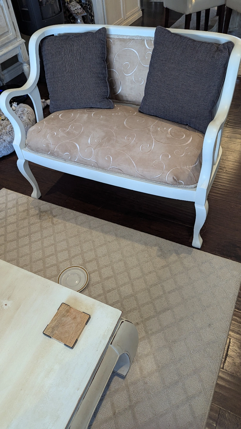 Vintage Walnut bench and matching chair .Both have been painted in a cottage white and recovered with a suede like fabric.Very solid..Pick up in Lindsay..