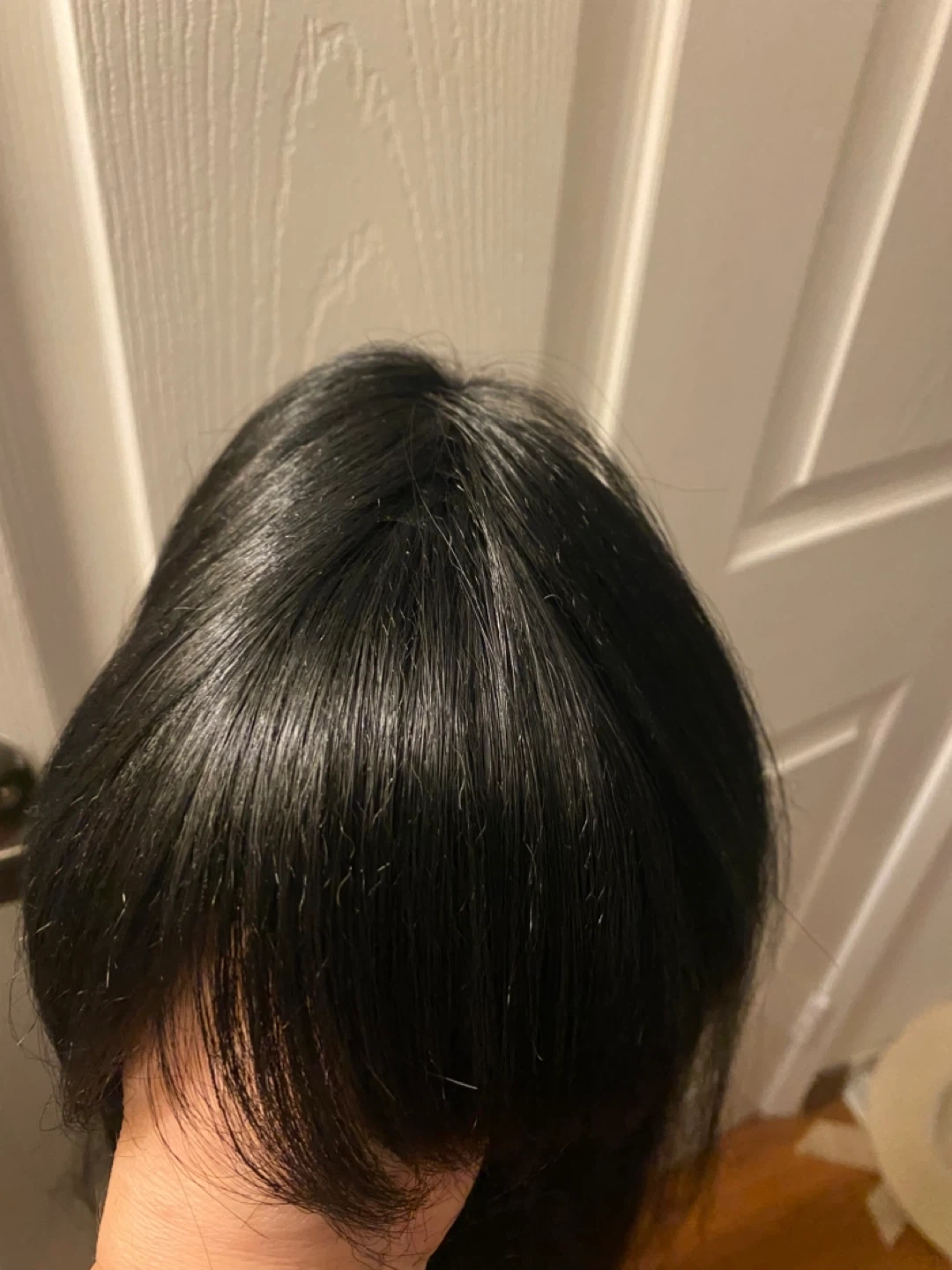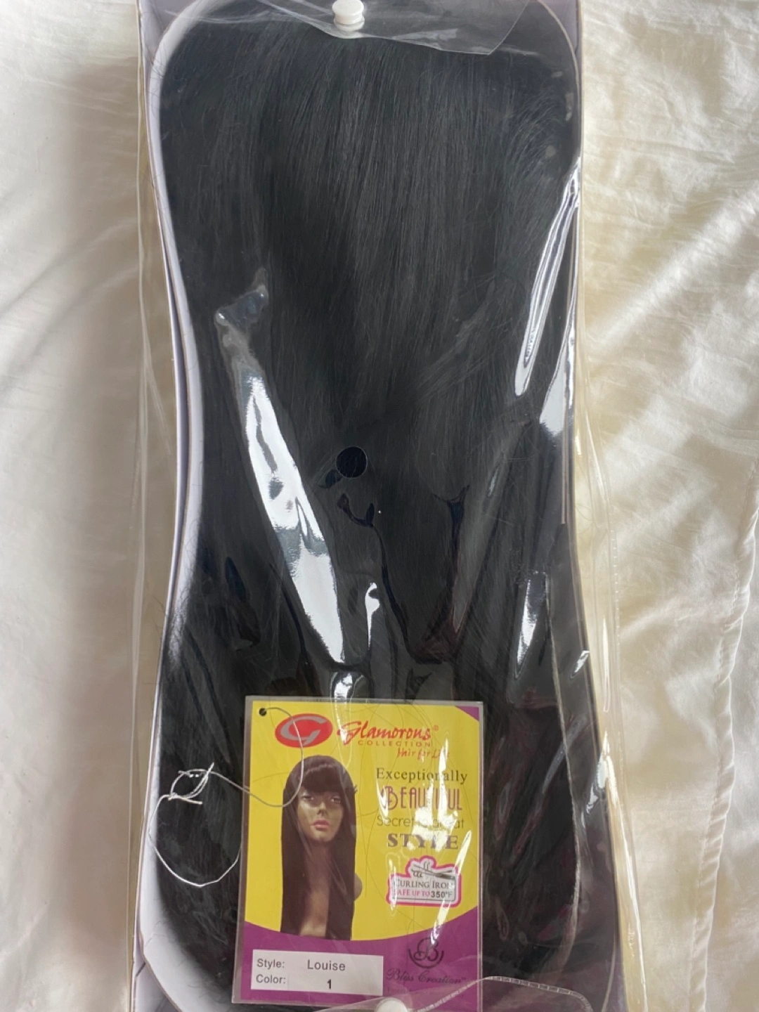 Long black wig with bangs. Style Louise, colour 1. Worn a couple of times. Heat resistant up to 350°F.