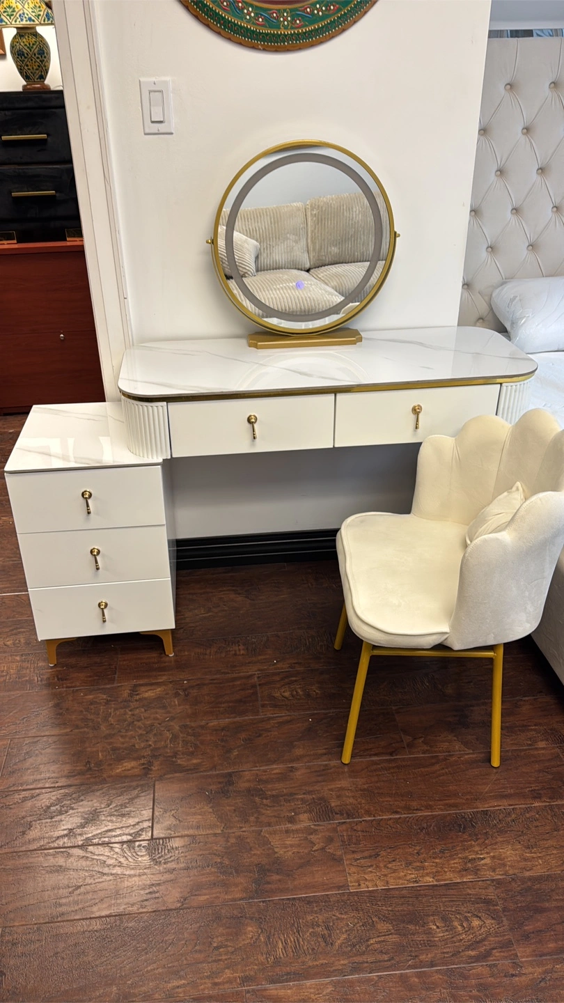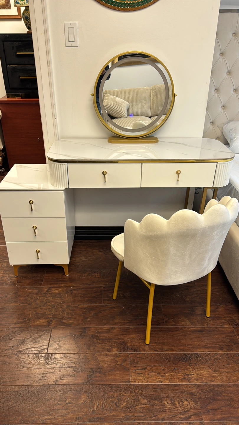 Elegant white vanity set. Features marble top, gold accents, three drawers, and a round mirror. Includes a matching vanity chair. Perfect for a bedroom or boudoir.