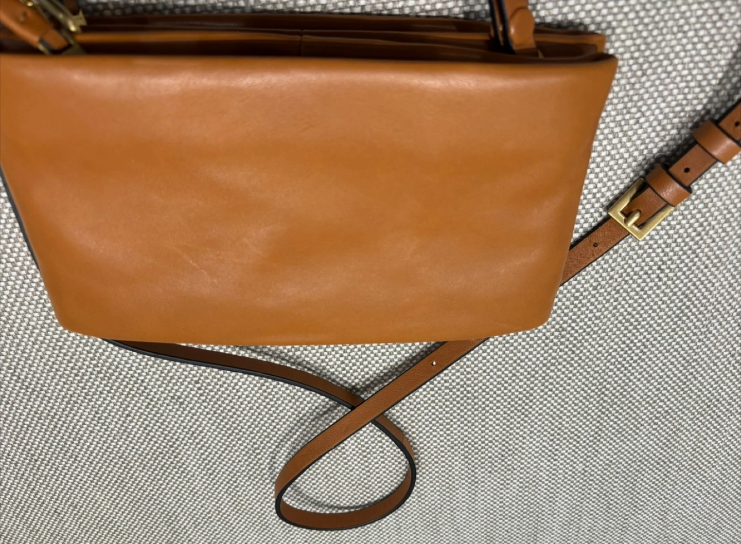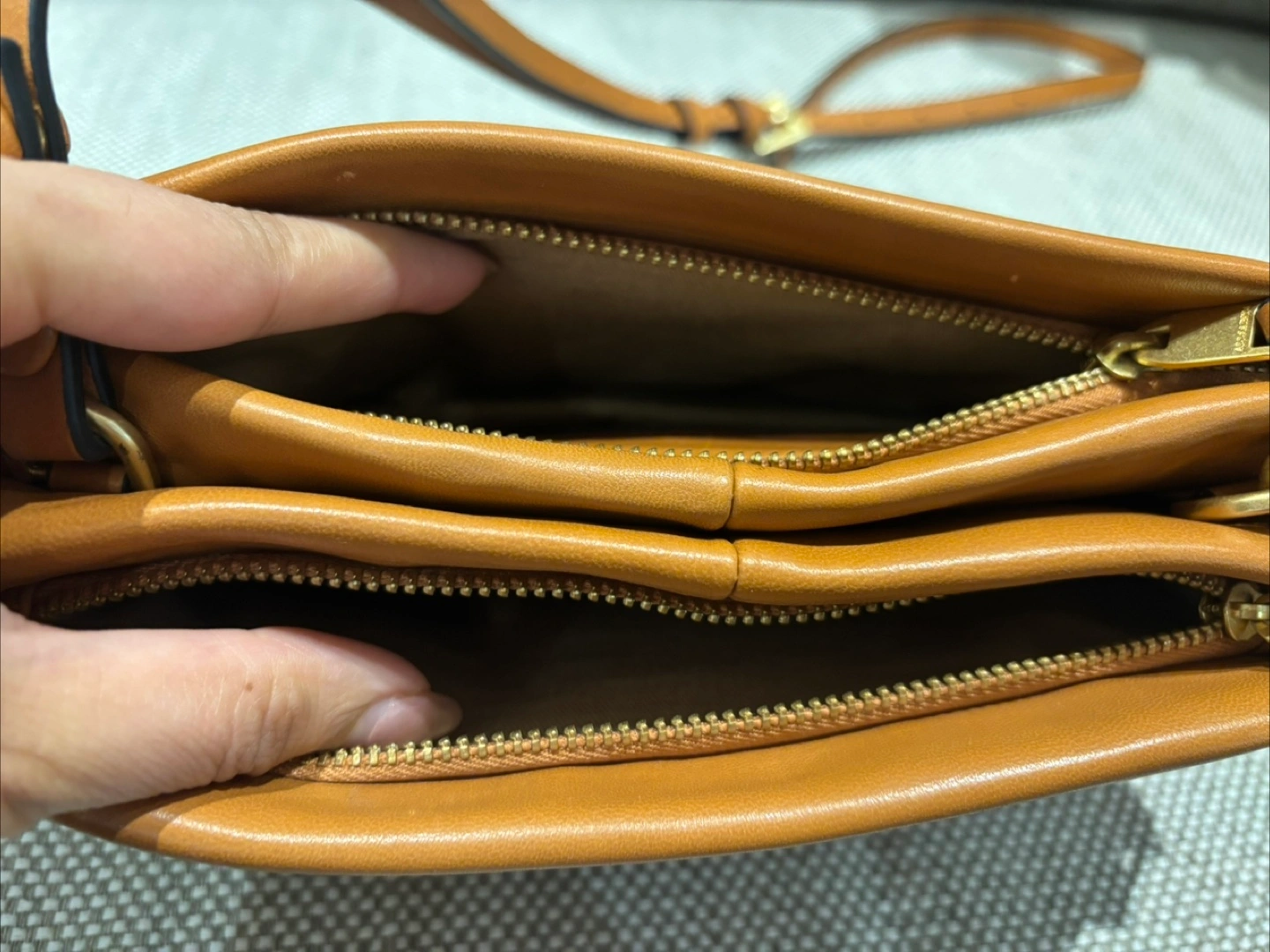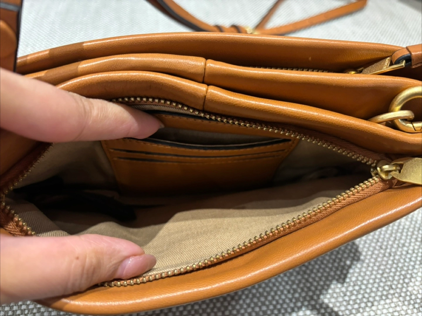 25Tan leather crossbody bag. Adjustable strap. Gold-toned hardware. Multiple compartments. Zipper closure.