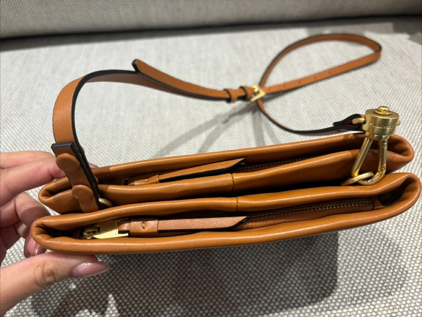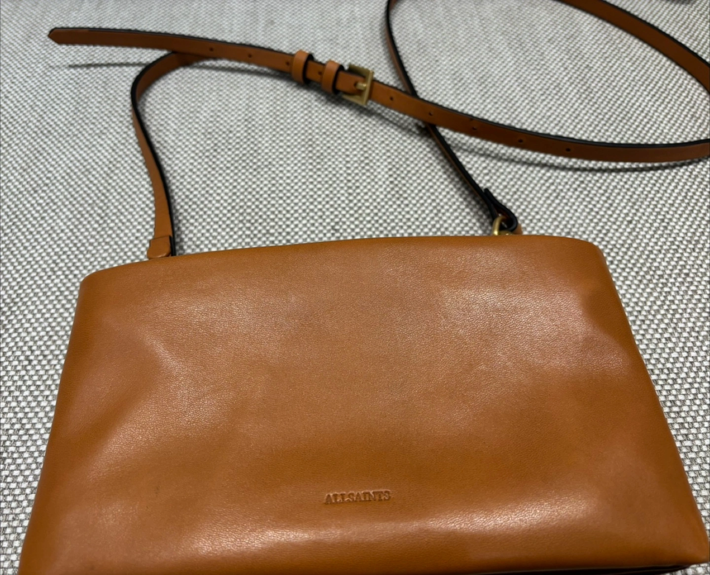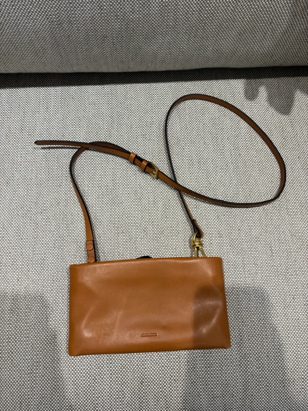 25Tan leather crossbody bag. Adjustable strap. Gold-toned hardware. Multiple compartments. Zipper closure.