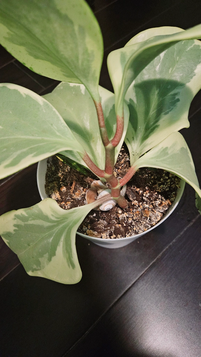 Healthy Peperomia in a white pot. Unique variegated leaves. Small snail shell included.