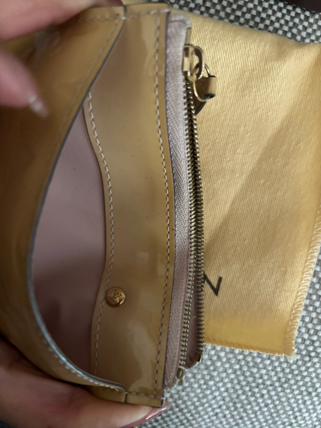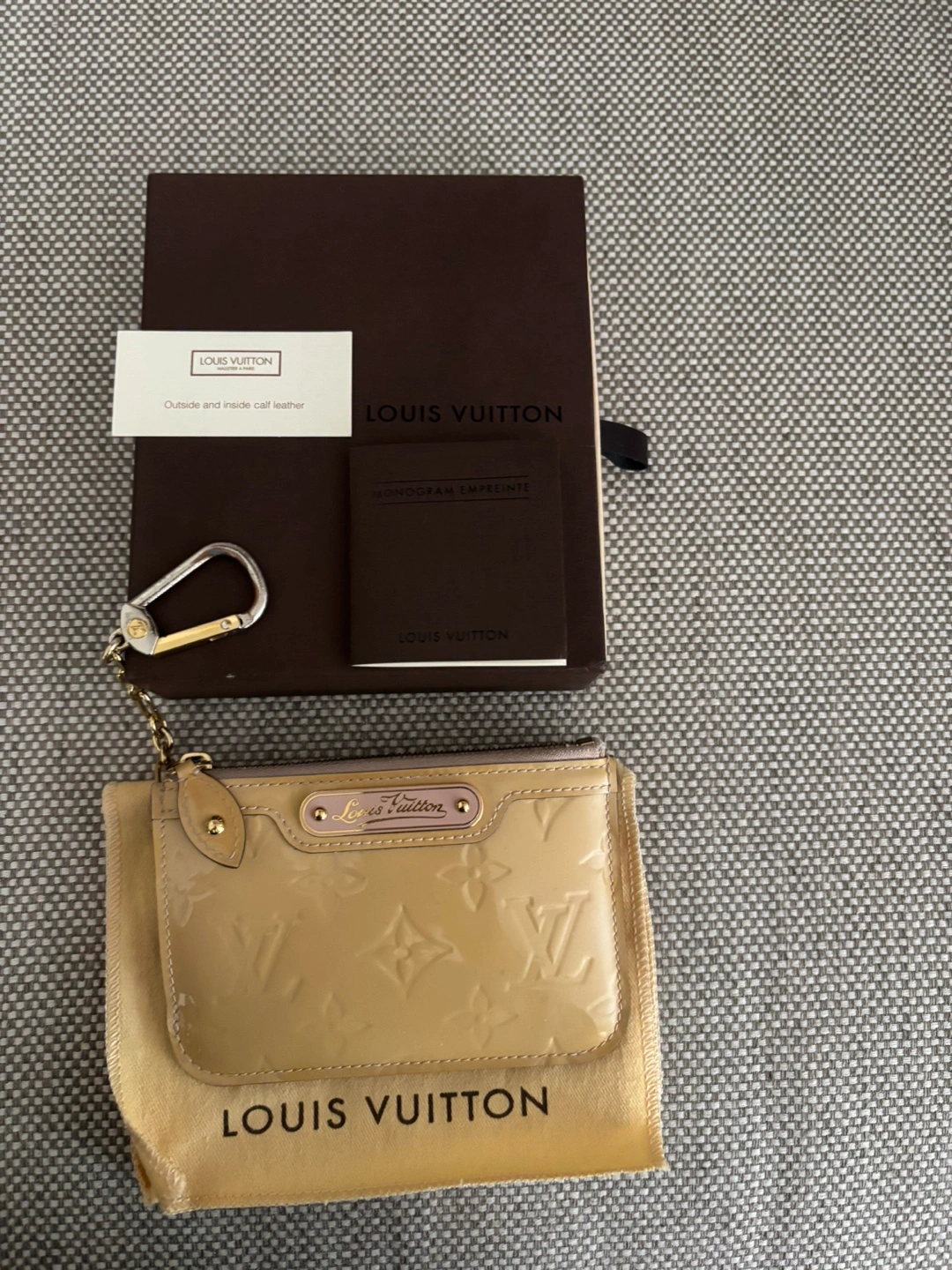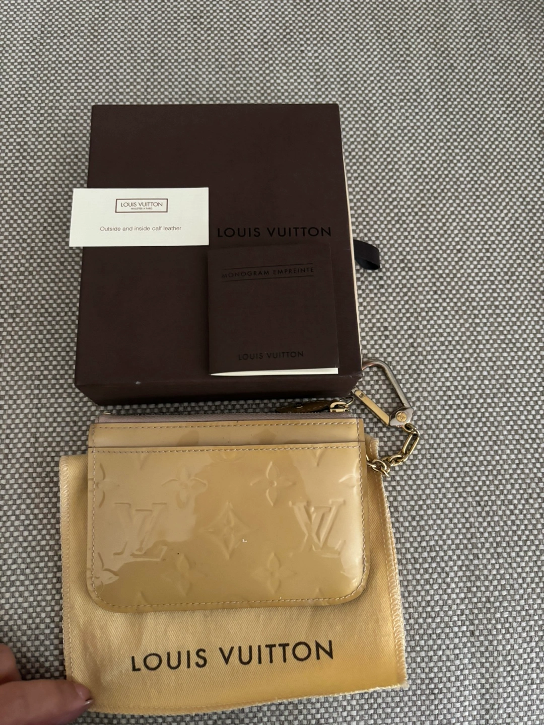 25Authentic Louis Vuitton coin purse. Pale yellow Empriente leather. Comes with box and dust bag. Features a zip closure and key ring.