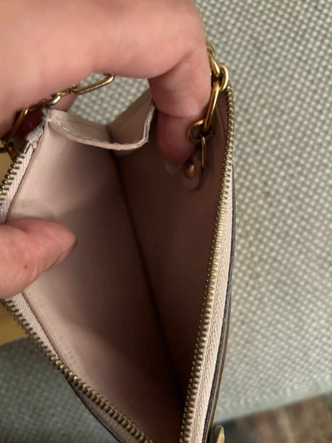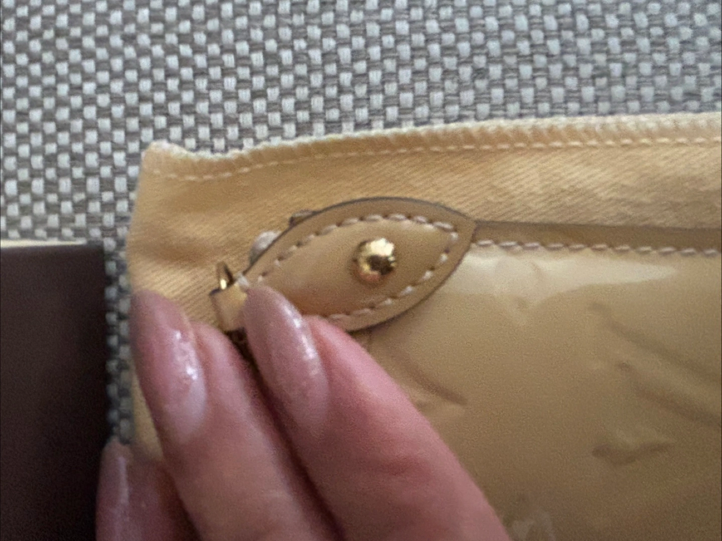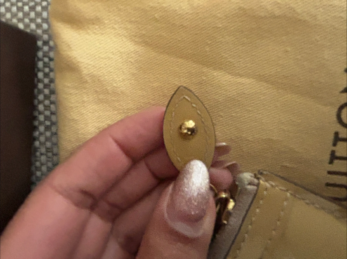 25Authentic Louis Vuitton coin purse. Pale yellow Empriente leather. Comes with box and dust bag. Features a zip closure and key ring.