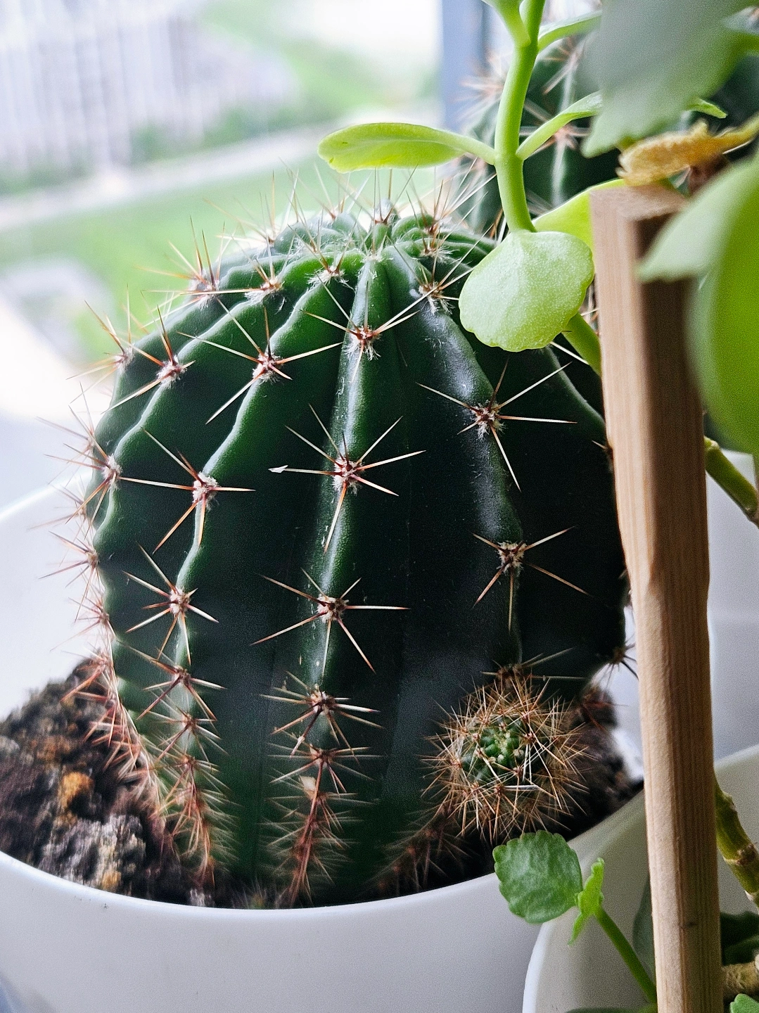 Succulent cactus plant, small size, dark green, many spines. Planted in a small white pot. Healthy.