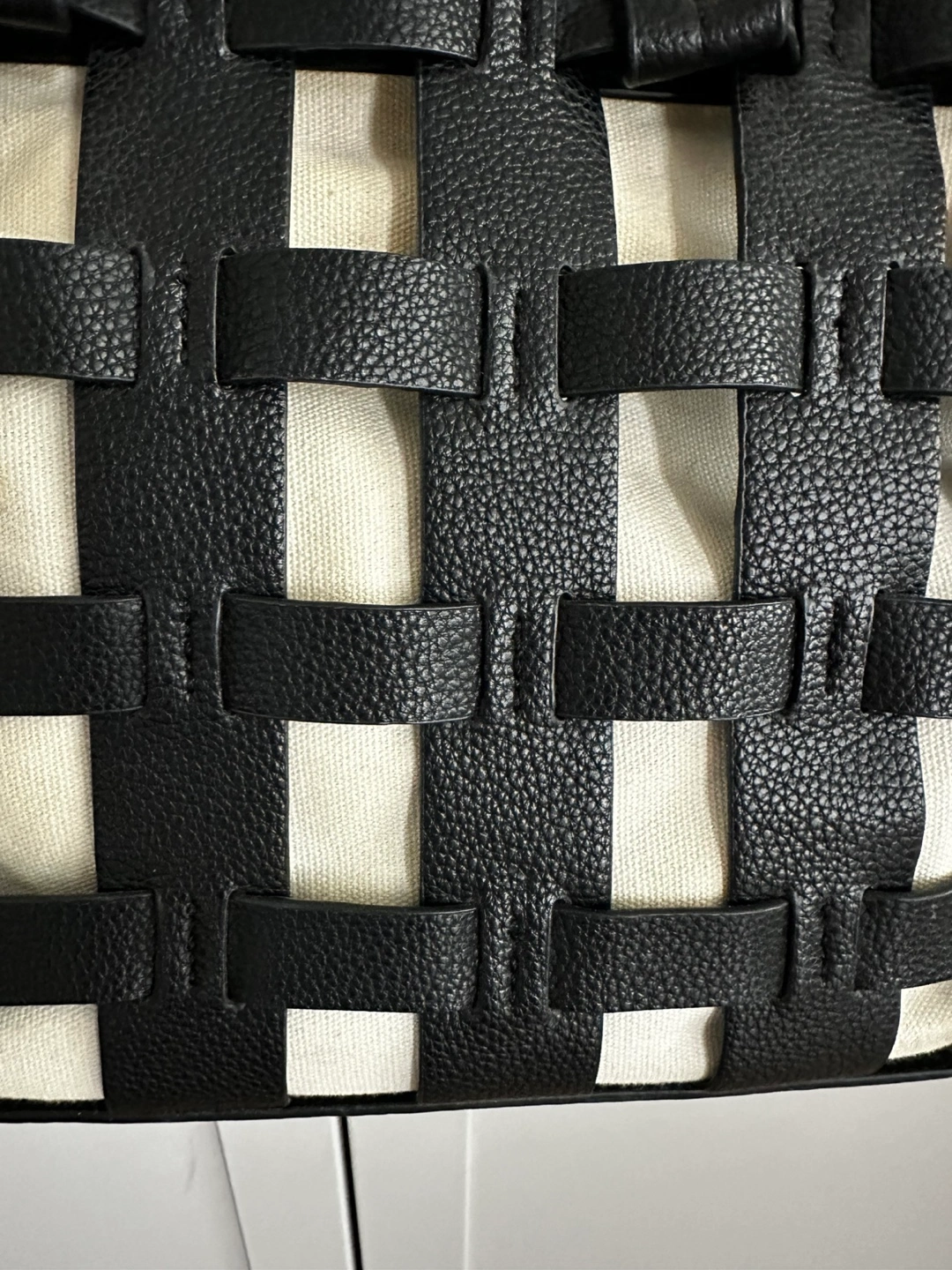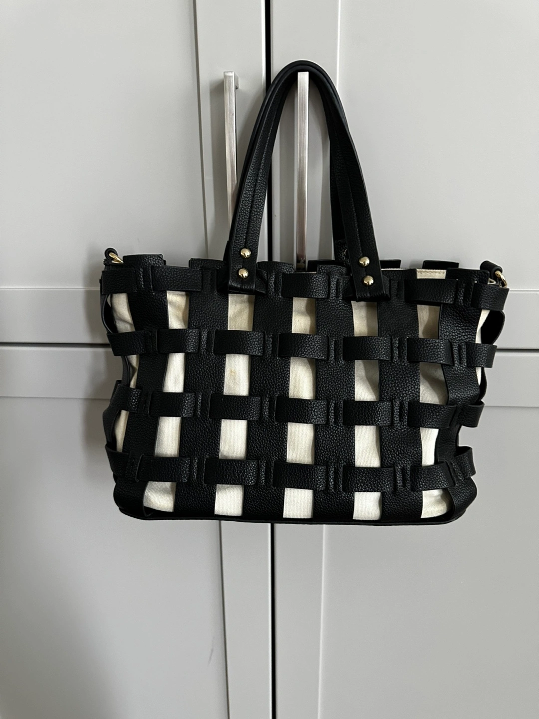 Stylish tote bag. Features a woven design with black faux leather and cream canvas. Top handles, zipper closure. Interior features a black and white striped fabric lining and a small zippered pocket.