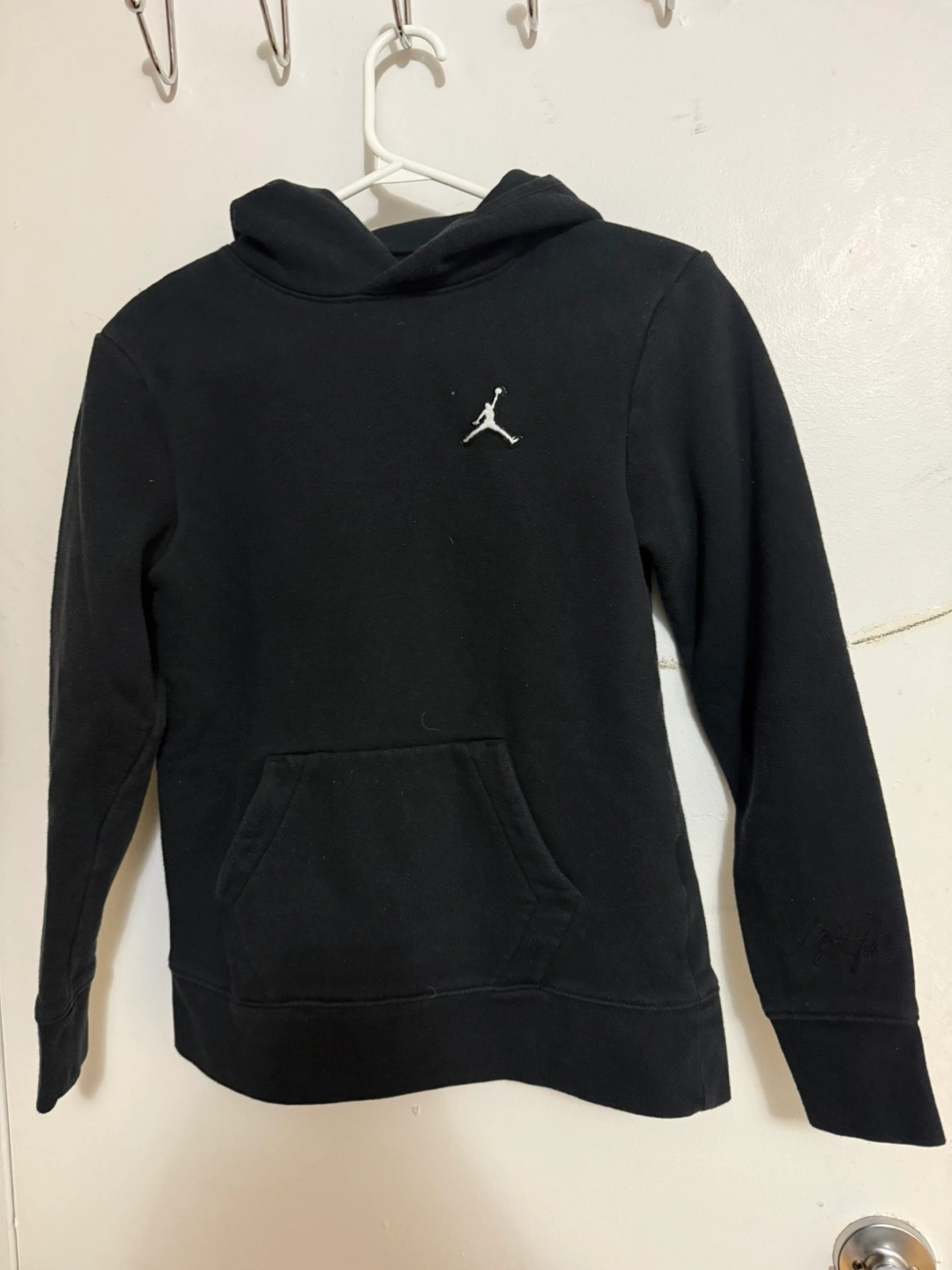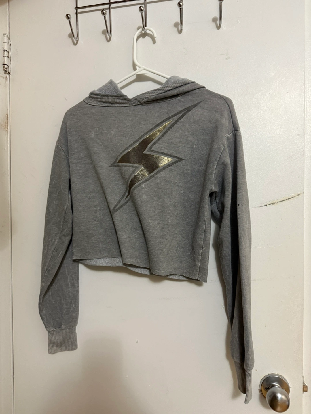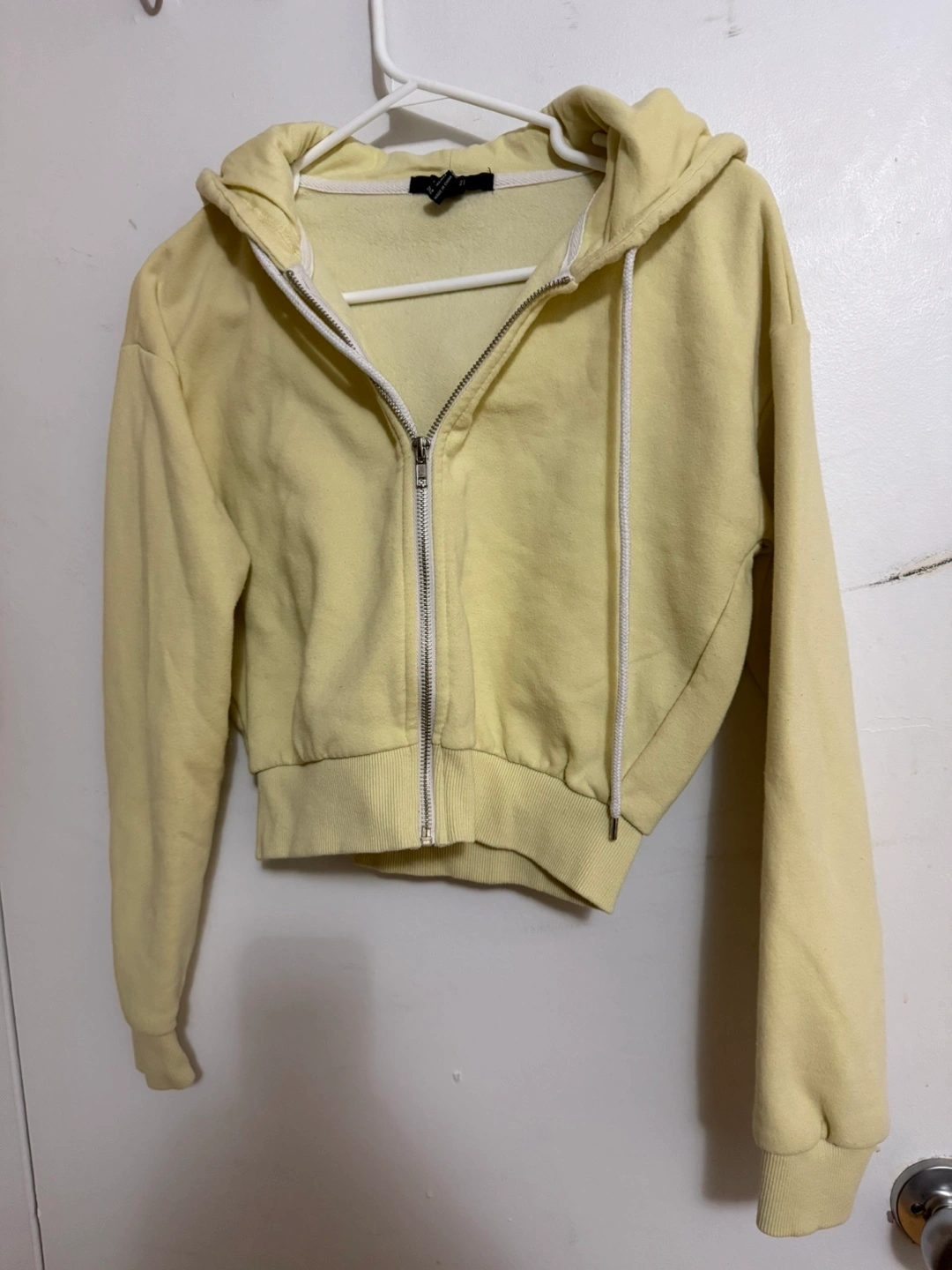 7633 hoodies in a bundle. Includes a black Jordan brand hoodie, a pale yellow Forever 21 zip-up hoodie, a grey cropped hoodie with lightning bolt graphic, Sizes vary please check the pictures.