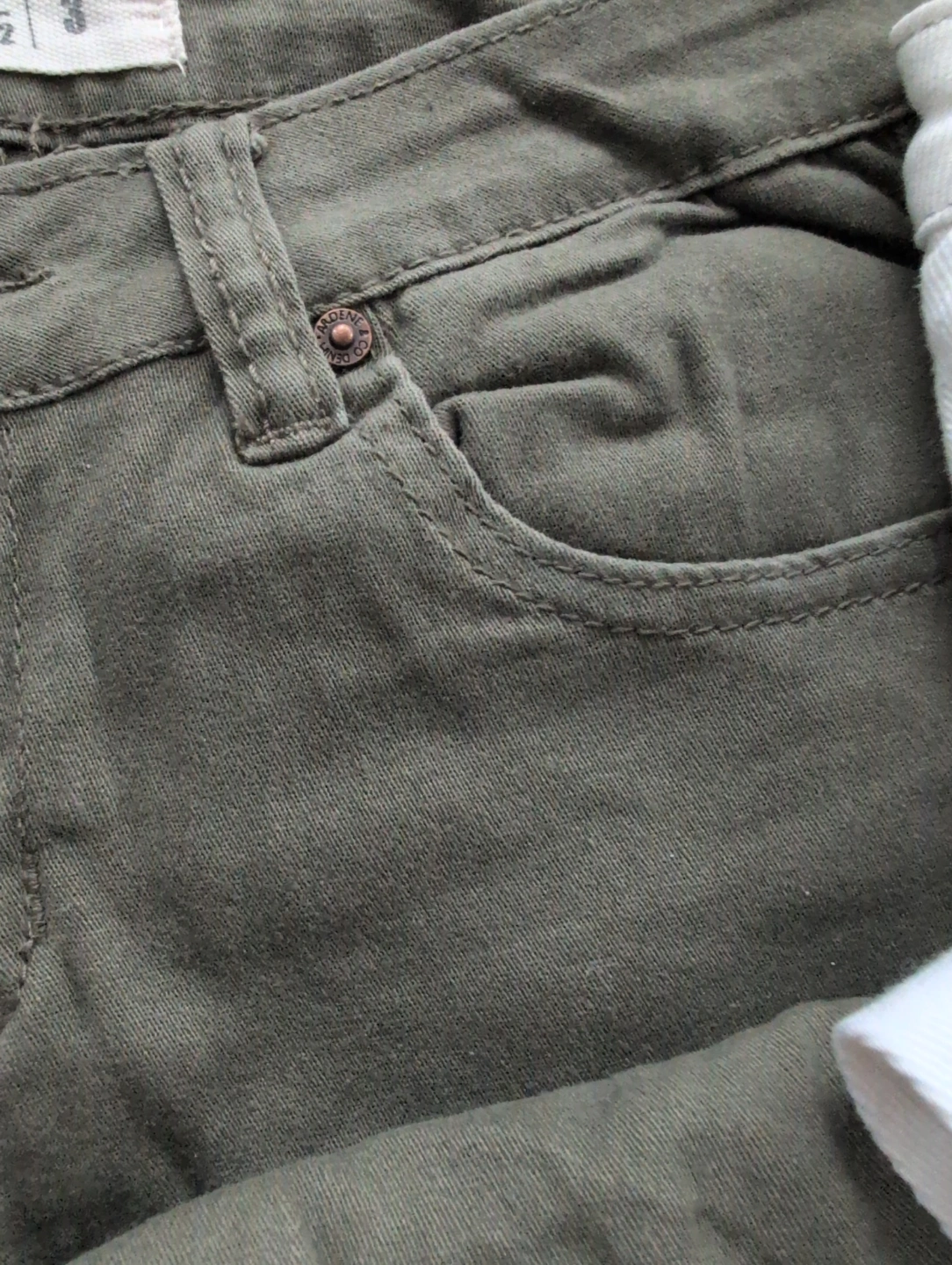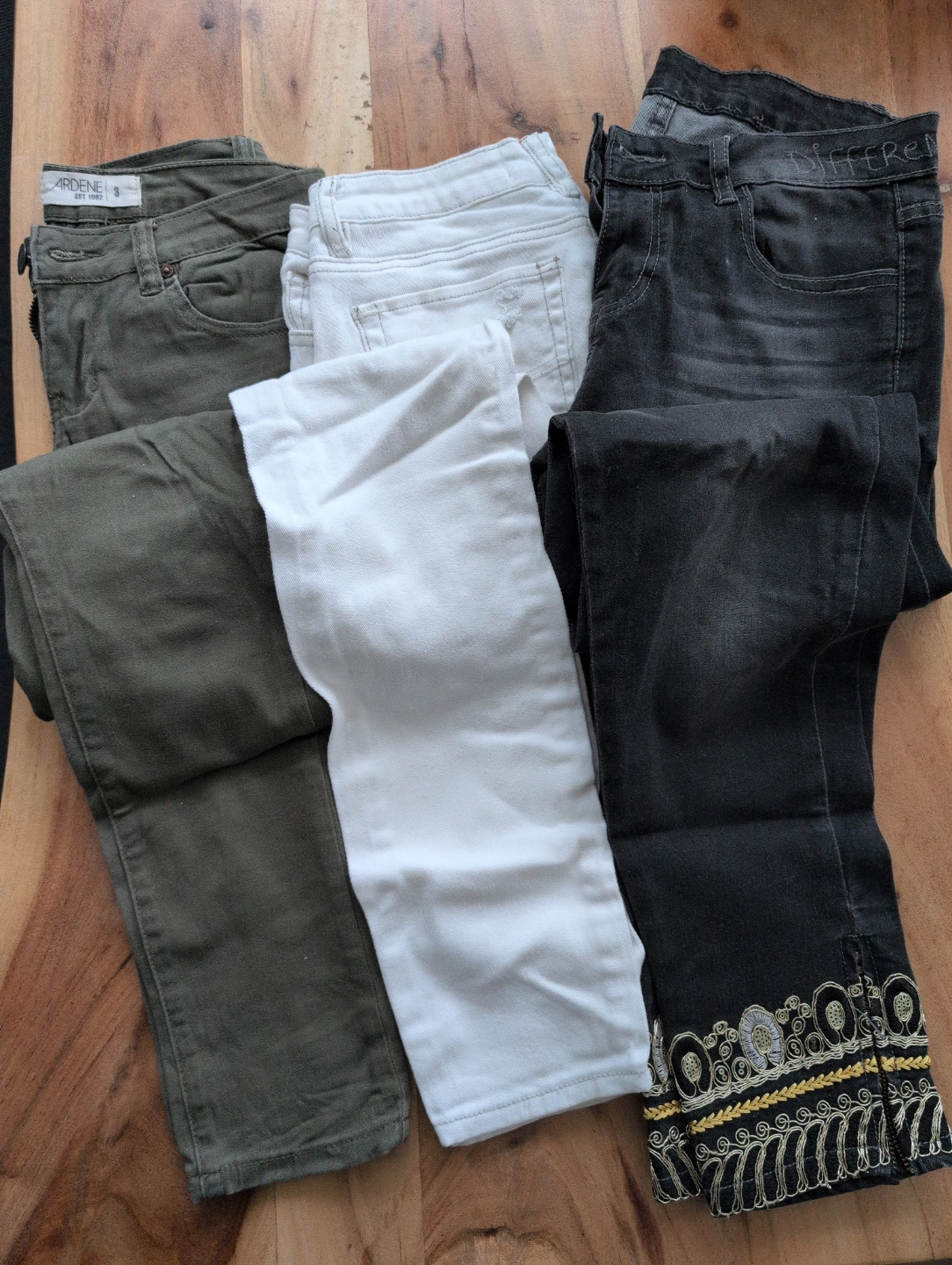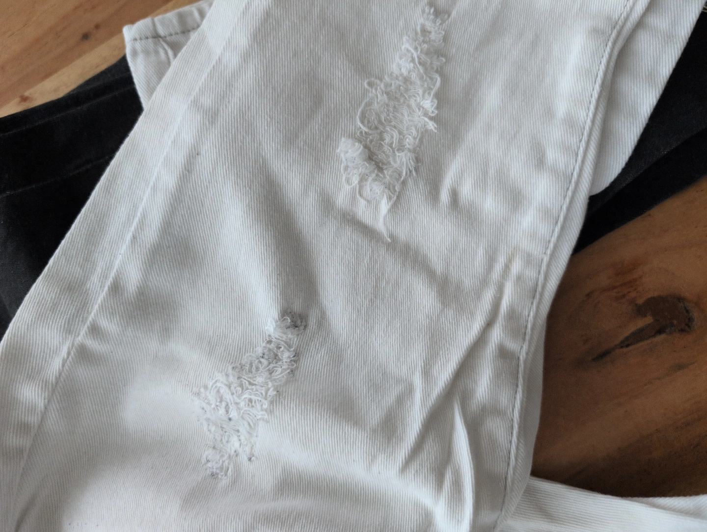 - Slim low waist white jeans with distressing (small stain that can be washed off) slightly xs
