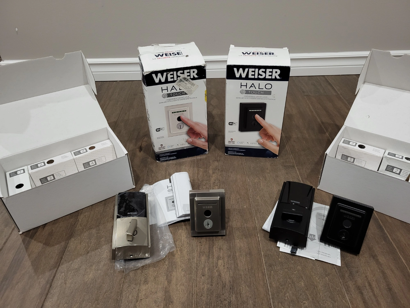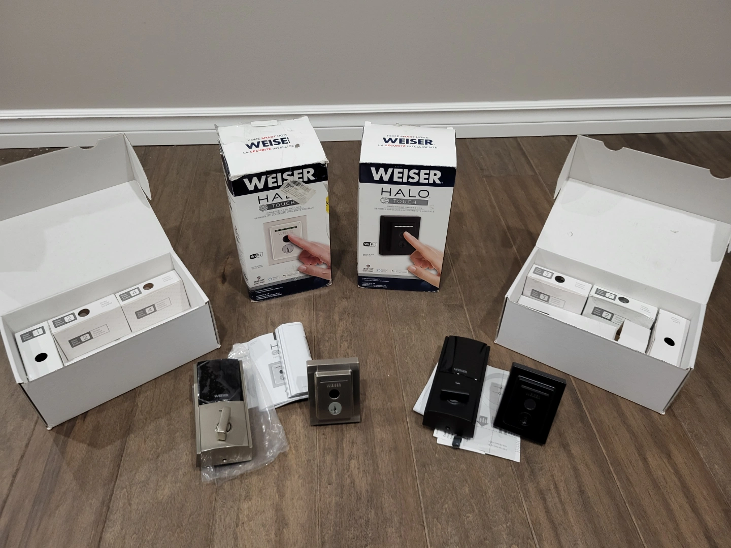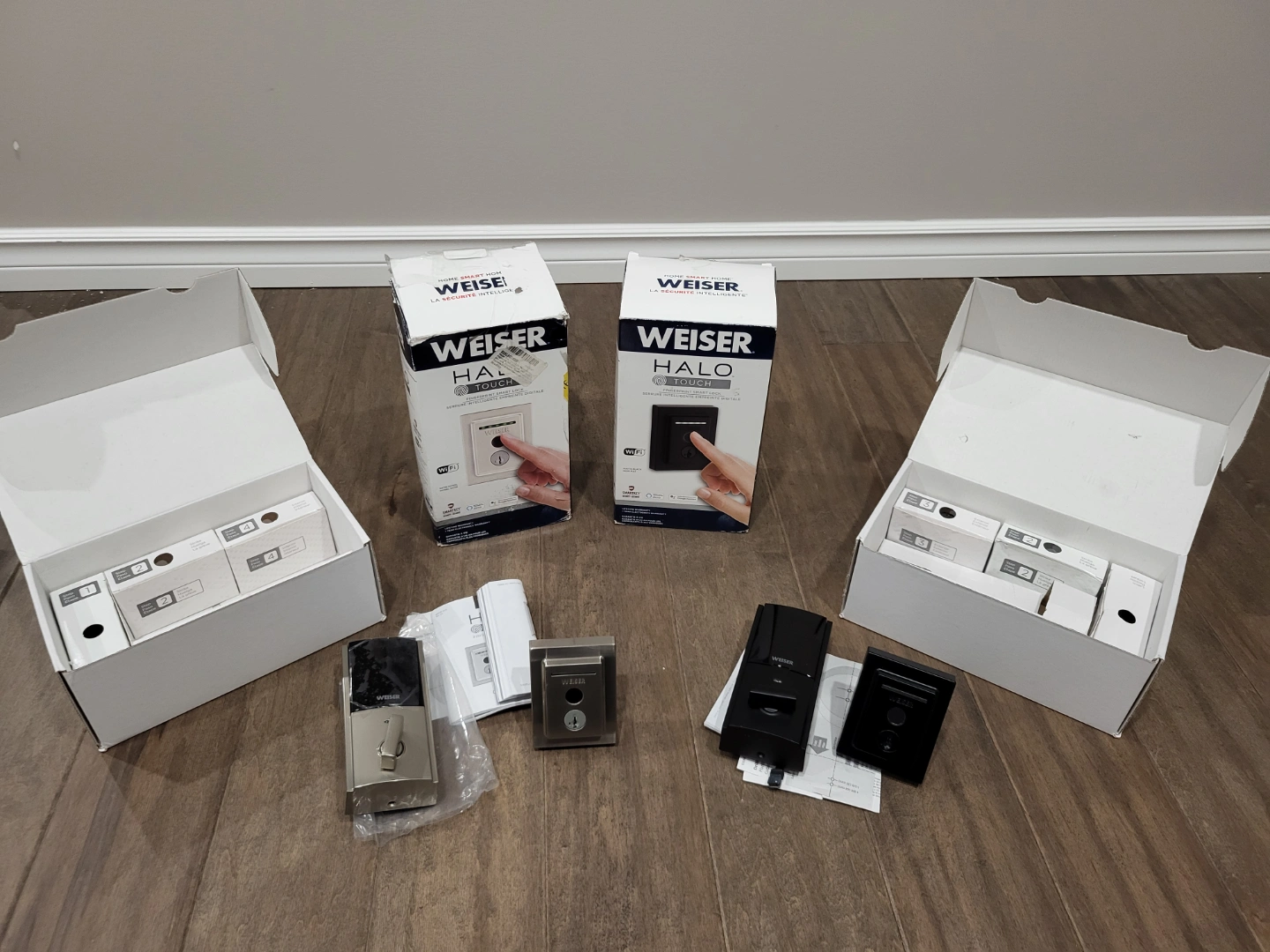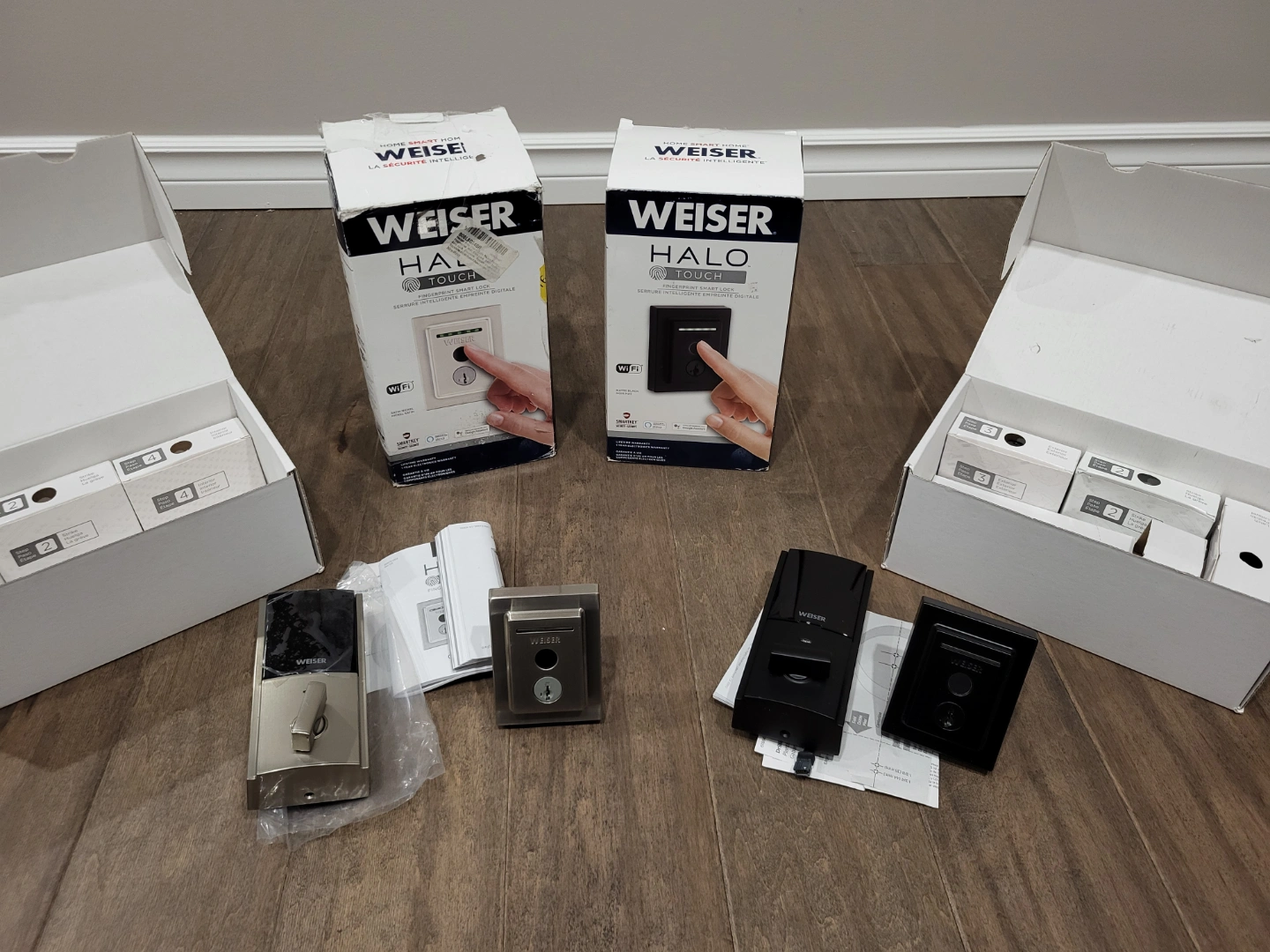 Brand new Weiser Halo Touch smart locks. Two complete sets, one satin nickel, one black. Includes all original packaging and hardware. Easy installation. Door, lock, fingerprint, locking, security, deadbolt. $170 each firm.