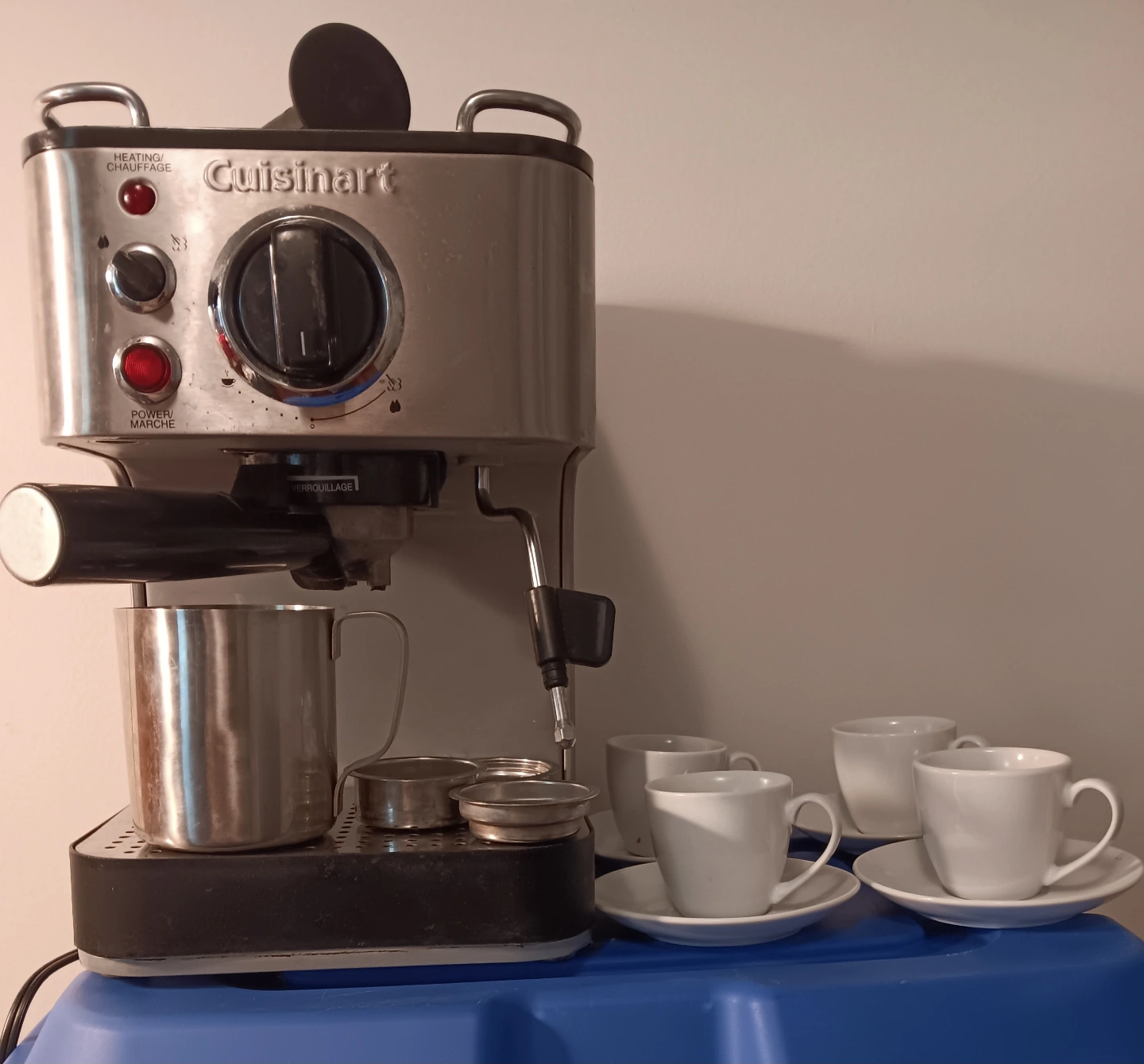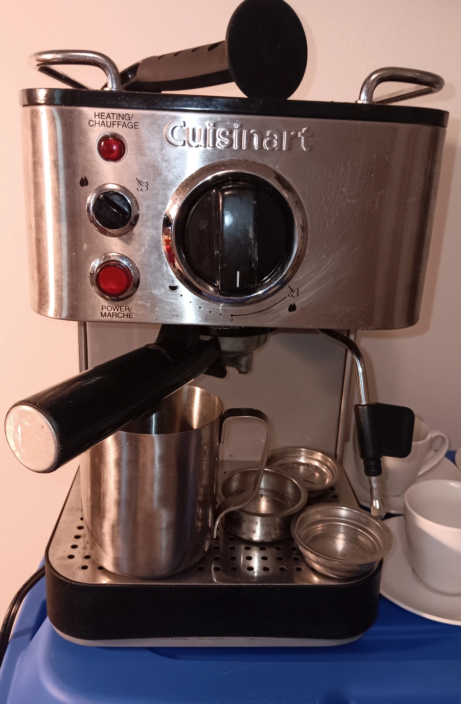 81Used Cuisinart espresso machine. Includes milk frother, portafilter, and four espresso cups and saucers. Great for making espresso at home.