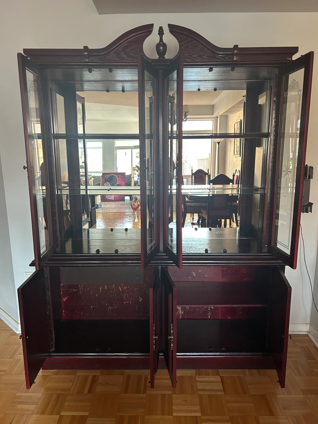 Large, dark-stained wood china cabinet. Features glass doors, interior shelving, and a lower cabinet with doors. Inside lights.