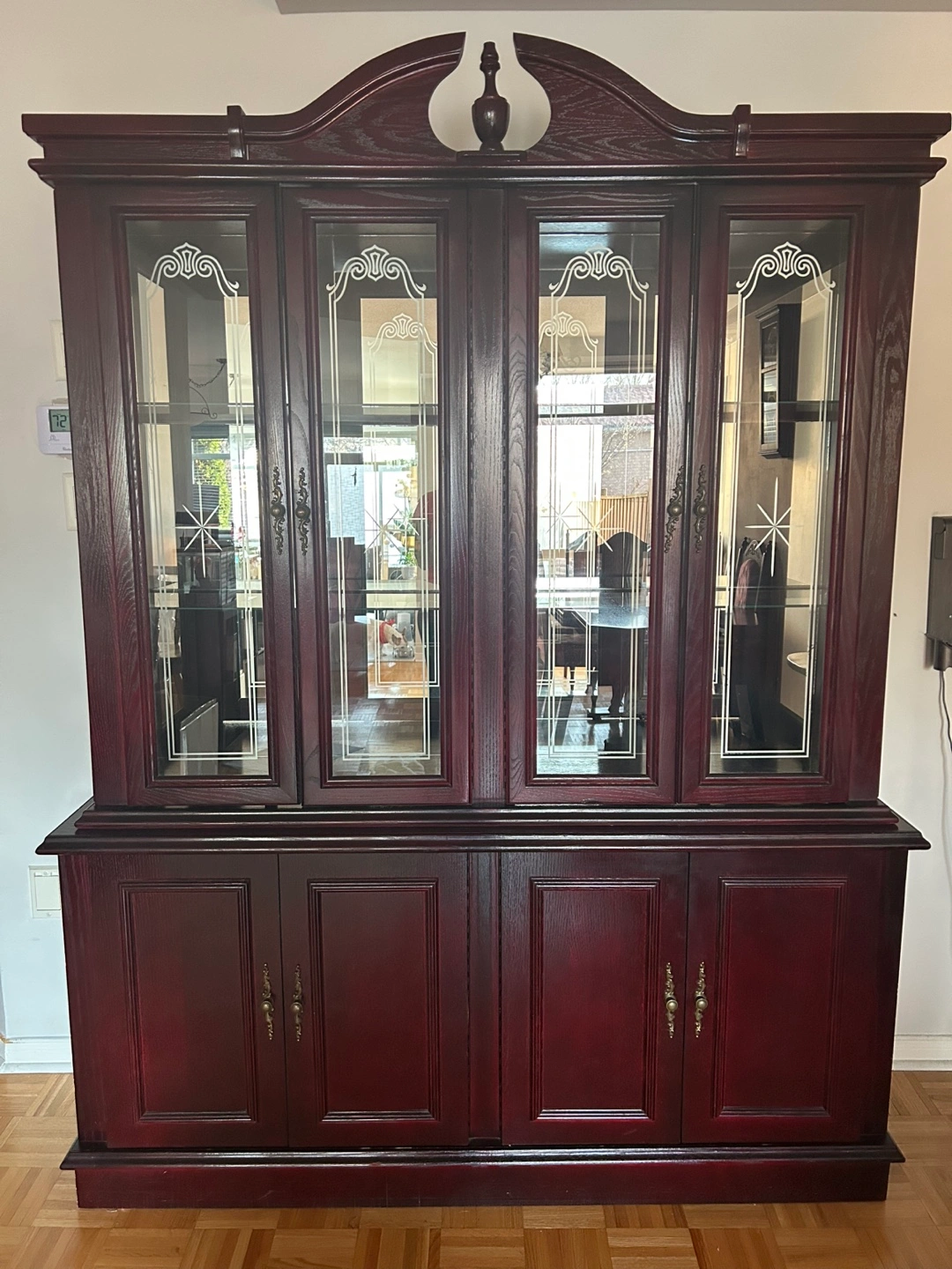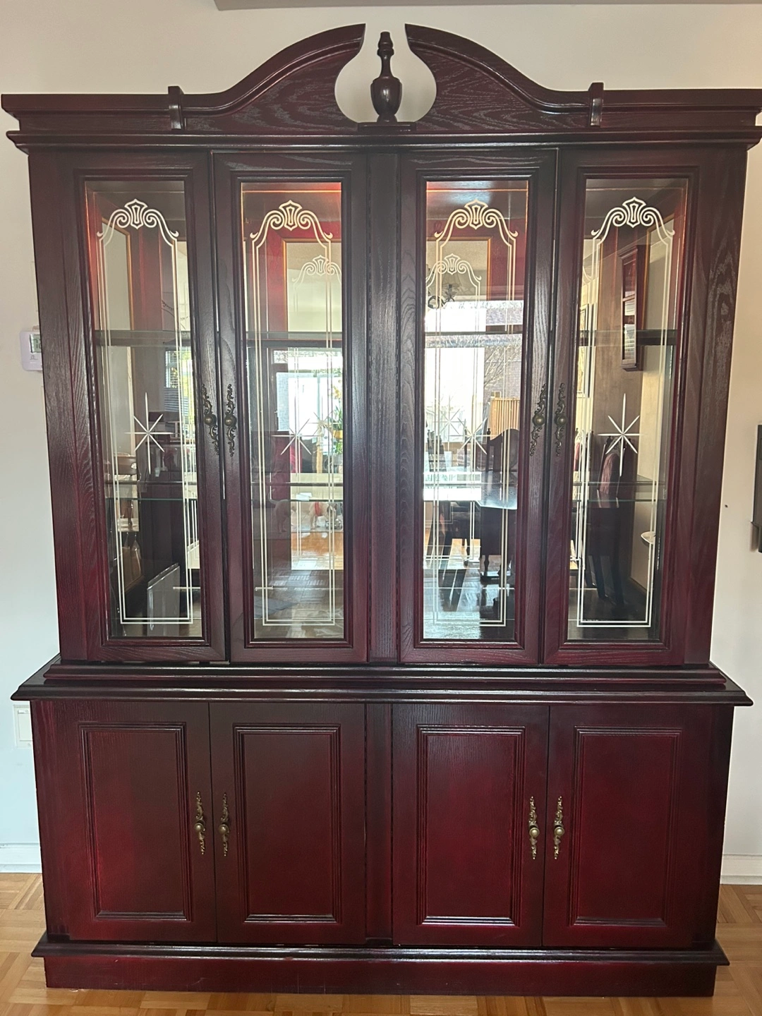 Large, dark-stained wood china cabinet. Features glass doors, interior shelving, and a lower cabinet with doors. Inside lights.