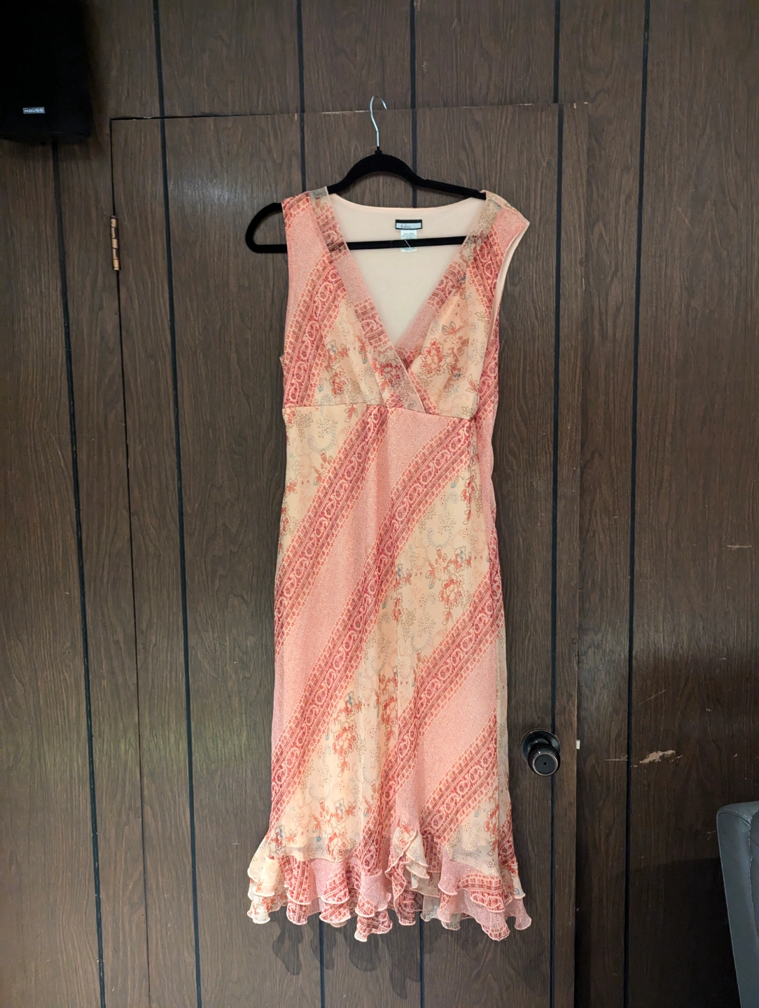 Stunning sleeveless vintage midi dress. Peach and coral floral pattern. V-neckline. Double-layered ruffled hem. Lightweight material. Perfect for spring or summer.