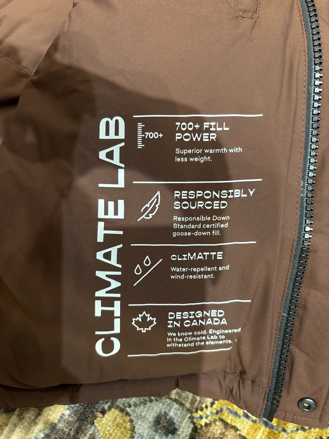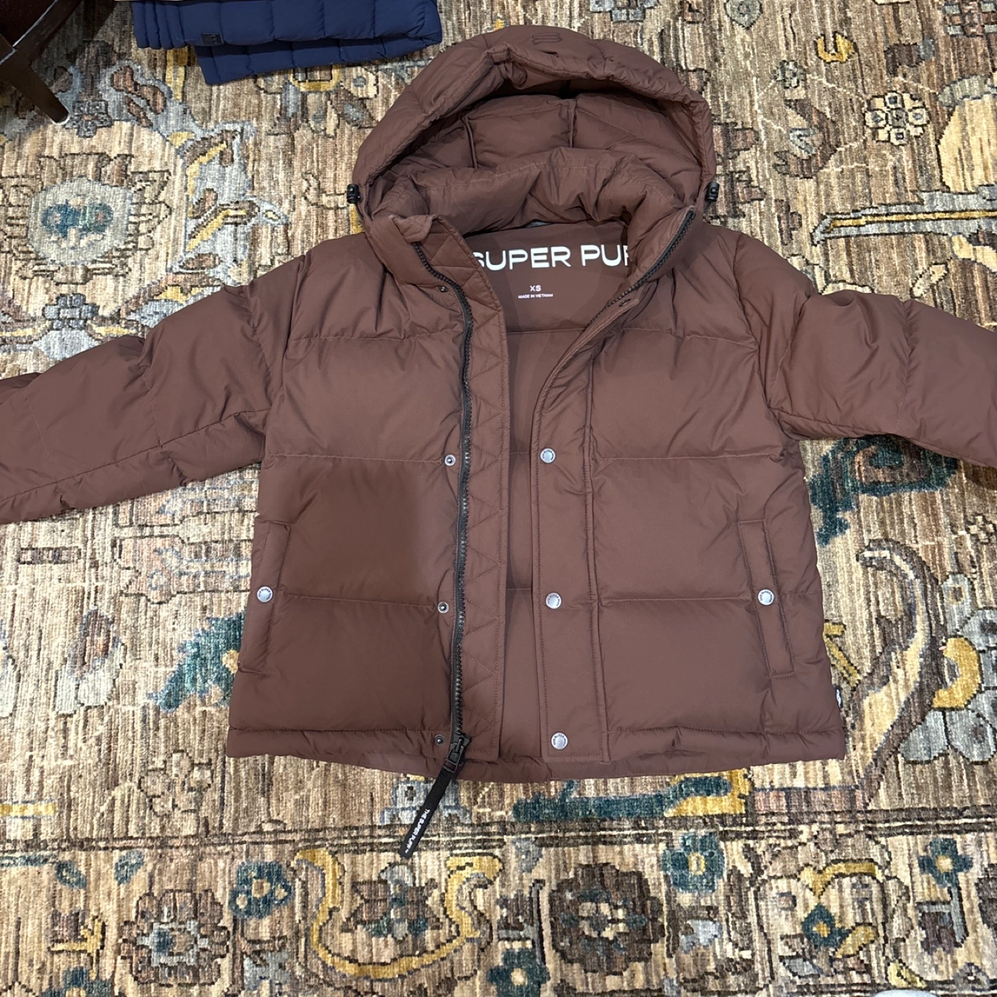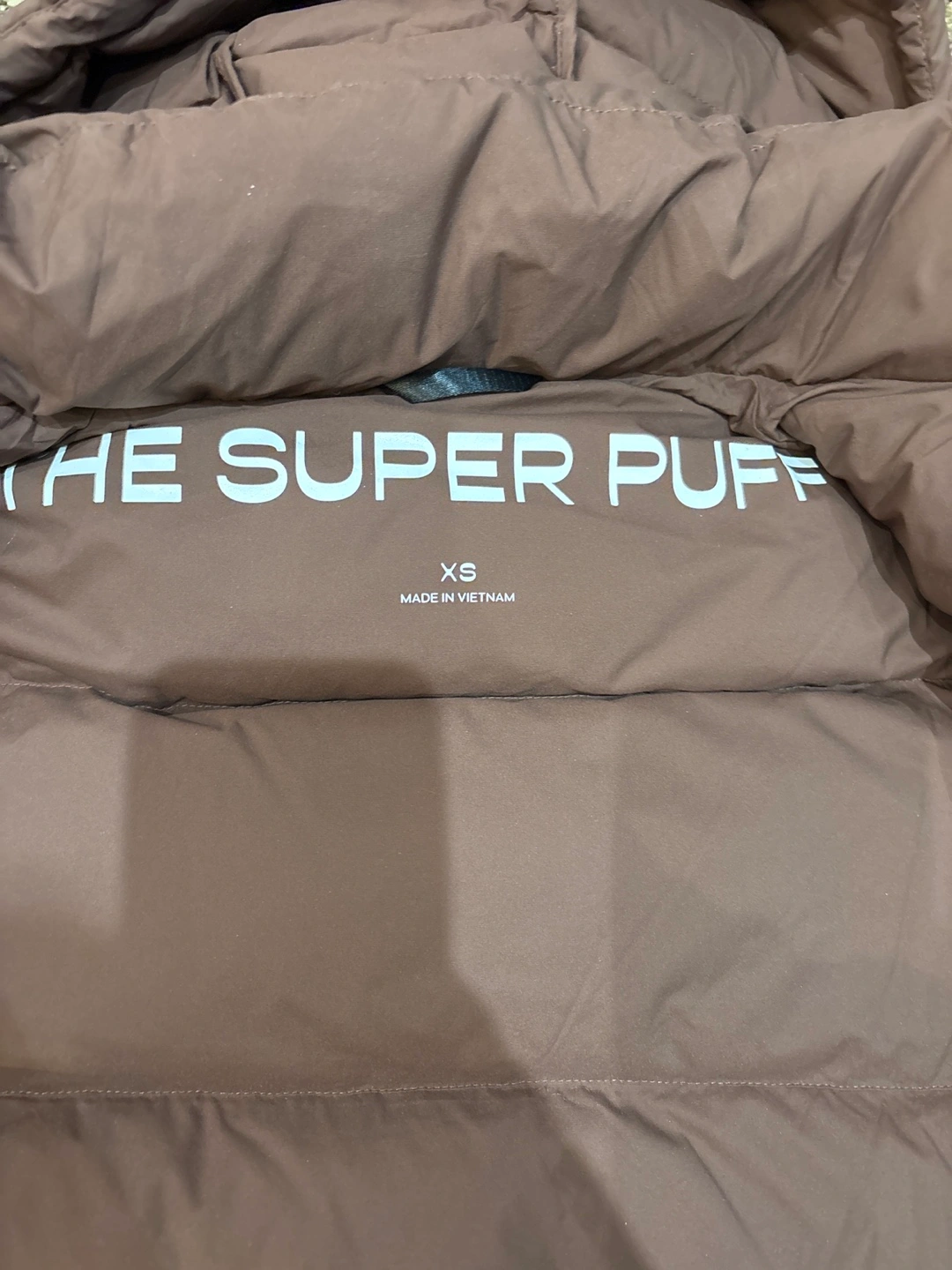 25Women's size XS brown puffer jacket. Features a hood and zip closure. 700+ fill power. Responsibly sourced down. Water-repellent and wind-resistant. Worn once.
