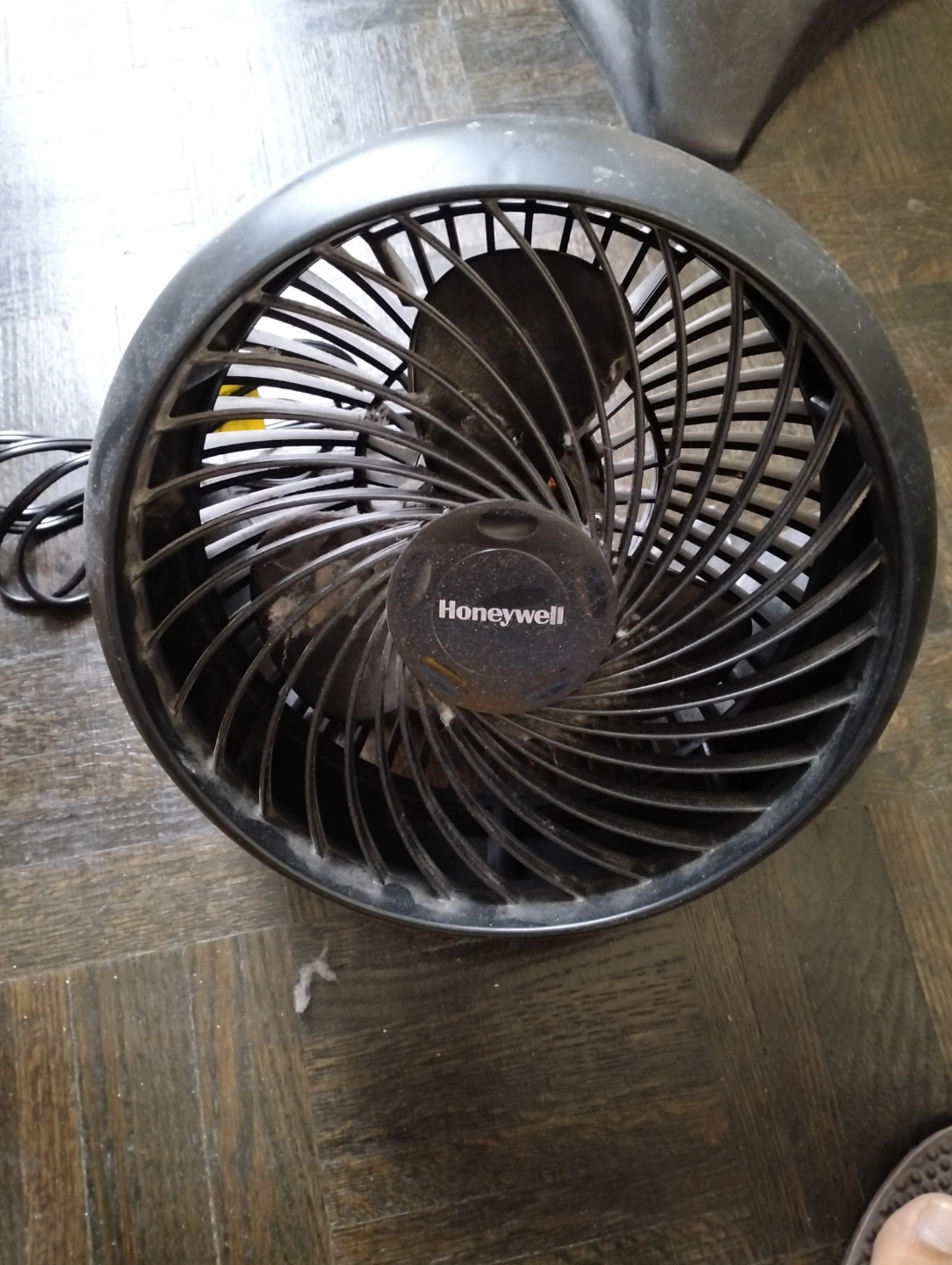 26Small, used Honeywell personal fan. Black plastic housing. Shows some dust and wear.