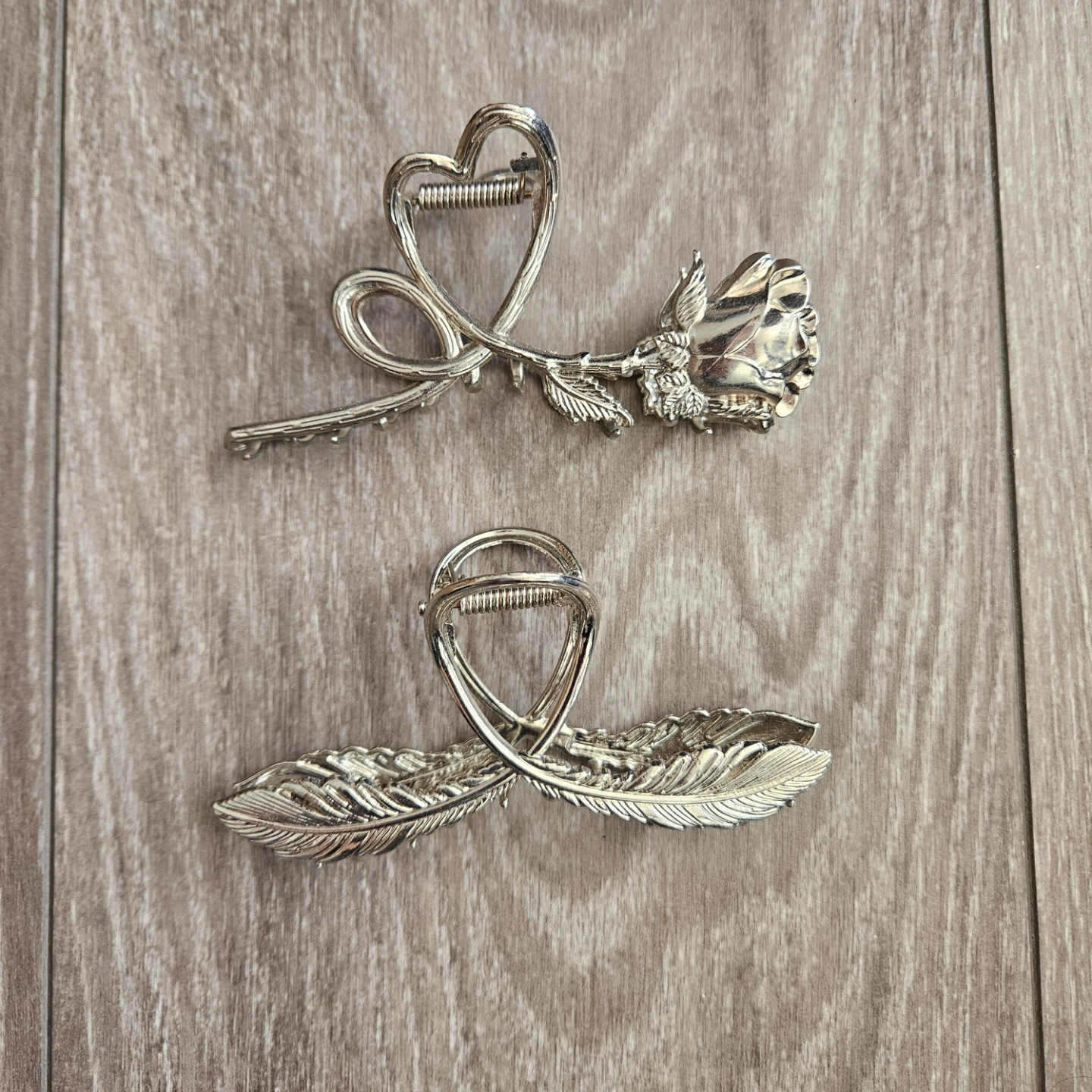 Pair of hair clips. Silver metal finish. One features a rose and heart design, other has feather accents. Unique and stylish.