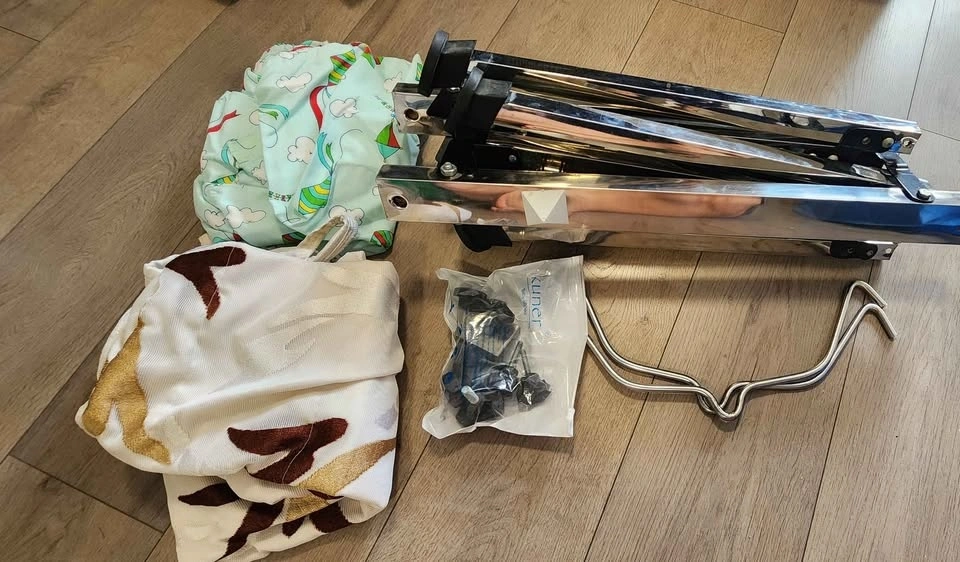 Selling a foldable Indian baby ghodiyu with a strong metal stand. Features hangers with noise-free moulded gaskets for silent swinging, premium grade rubber legs for strong grip and safety, and a premium quality hammock (khoyu) with a mosquito net (set of 2). It's easy to assemble and transport, with a foldable design that saves space. Very comfortable for newborn babies, and it's strong and stable.