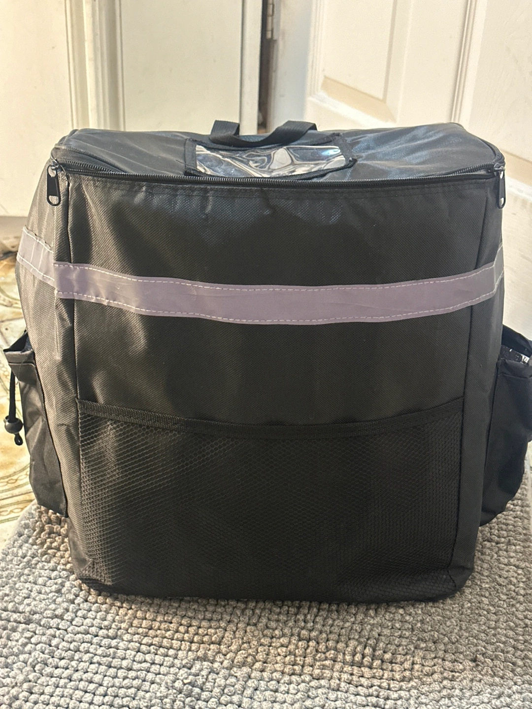 Large capacity insulated backpack. Multiple pockets and compartments. Reflective strips for safety. Great for food or other temperature-sensitive deliveries. Zipper closure. Adjustable shoulder straps.