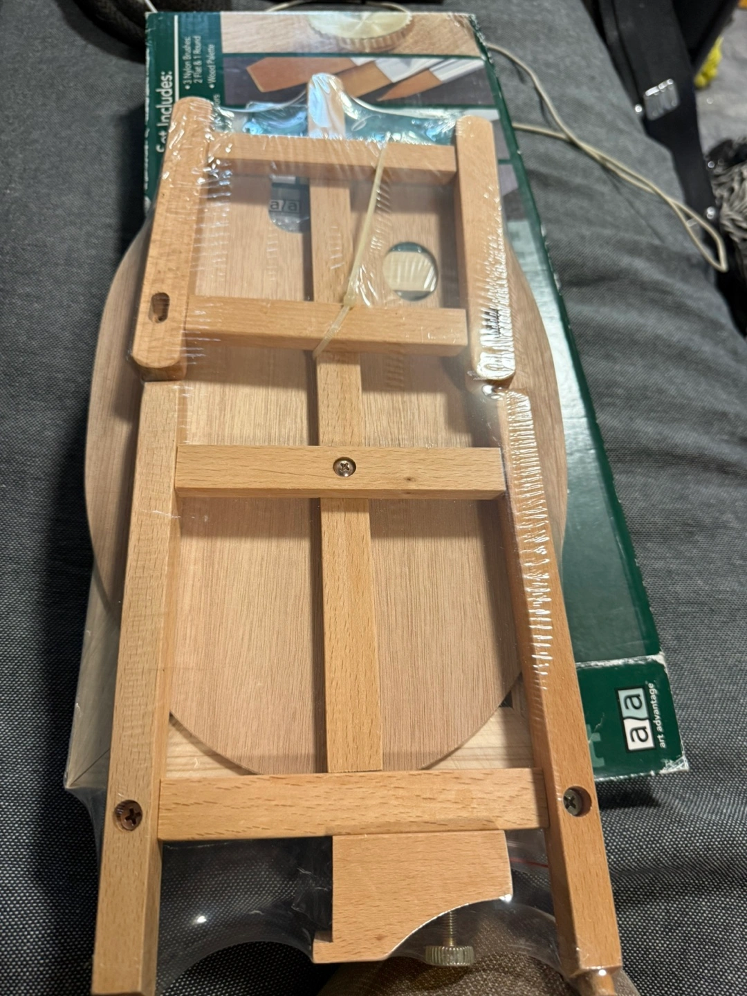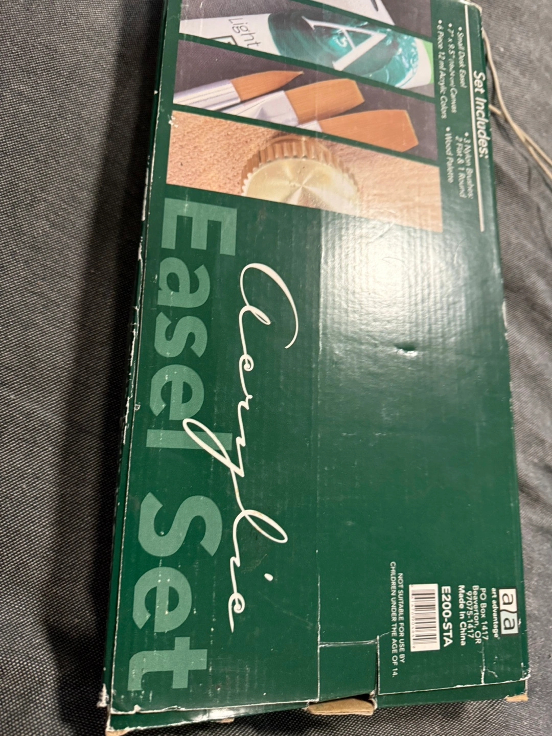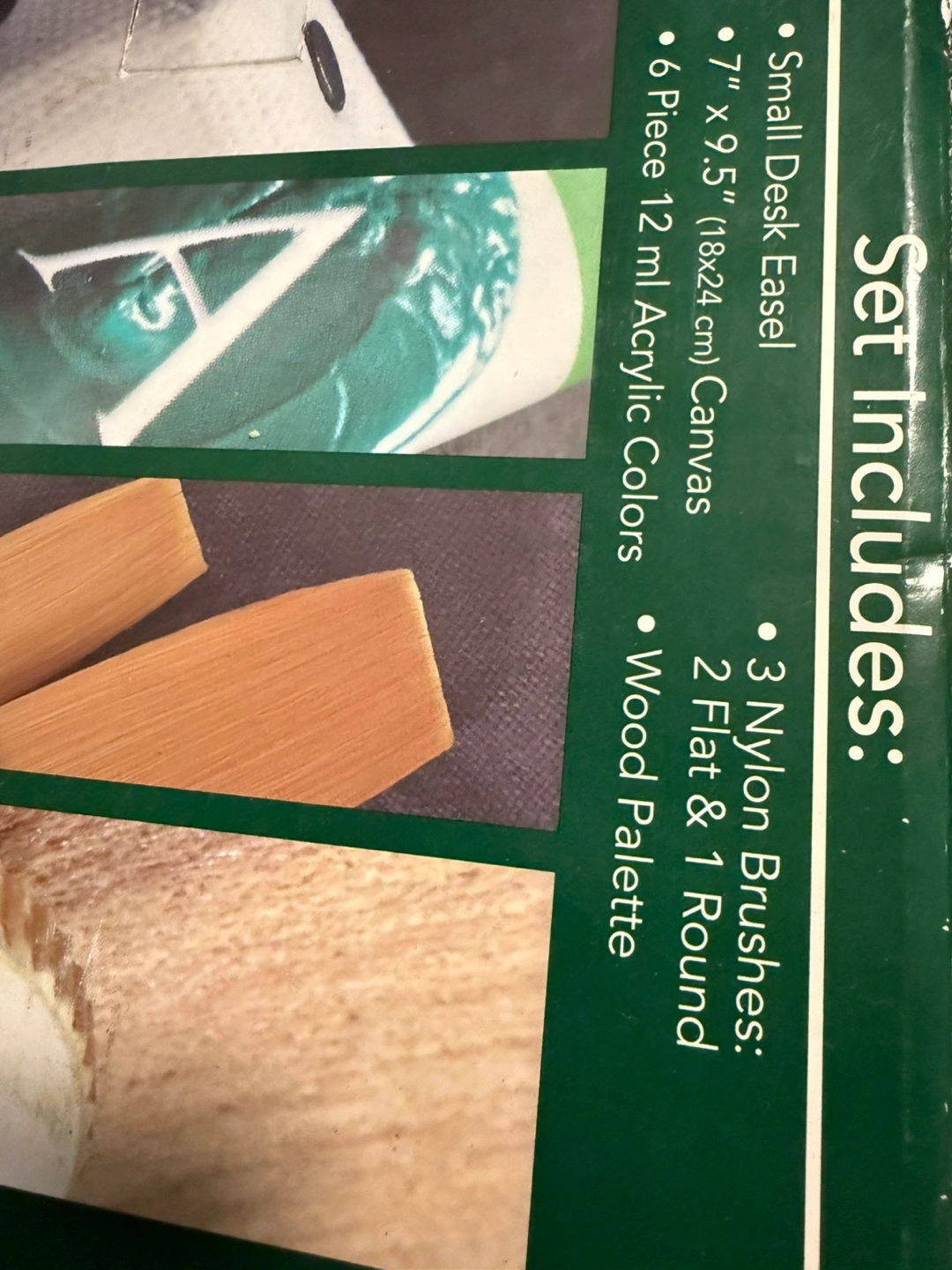New, unopened acrylic painting set. Includes small wooden easel, 7x9.5 inch canvas, 3 nylon brushes, 6 tubes of 12 ml acrylic paint, and wooden palette. Great for beginners!