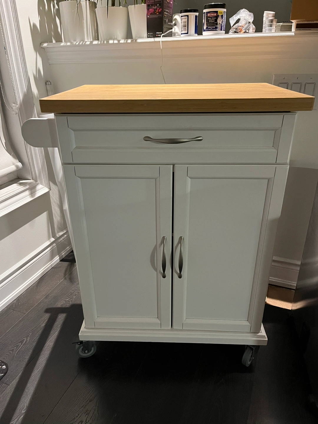 Rolling kitchen cart, white finish. Features a butcher block countertop, one drawer, double doors with interior shelving, and a towel bar. Great for extra storage and prep space.