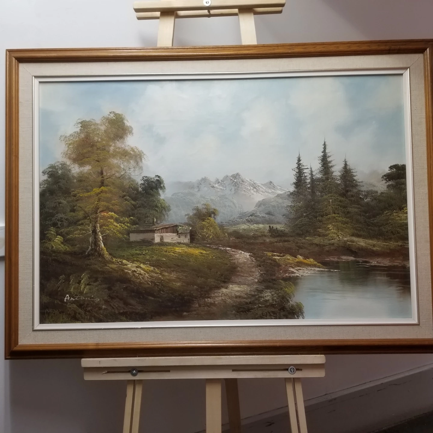 Beautiful vintage oil painting on canvas. Depicts a serene landscape scene. Features a rustic cabin, trees, and mountains. Signed by Antonio. Wooden frame. Ready to hang.