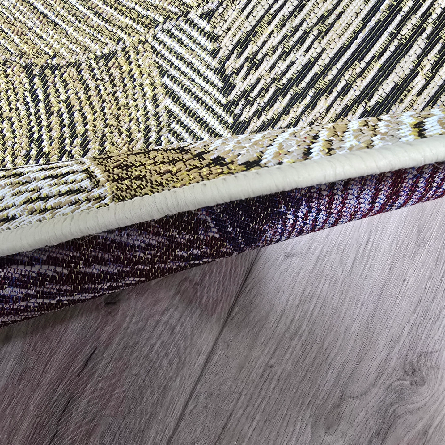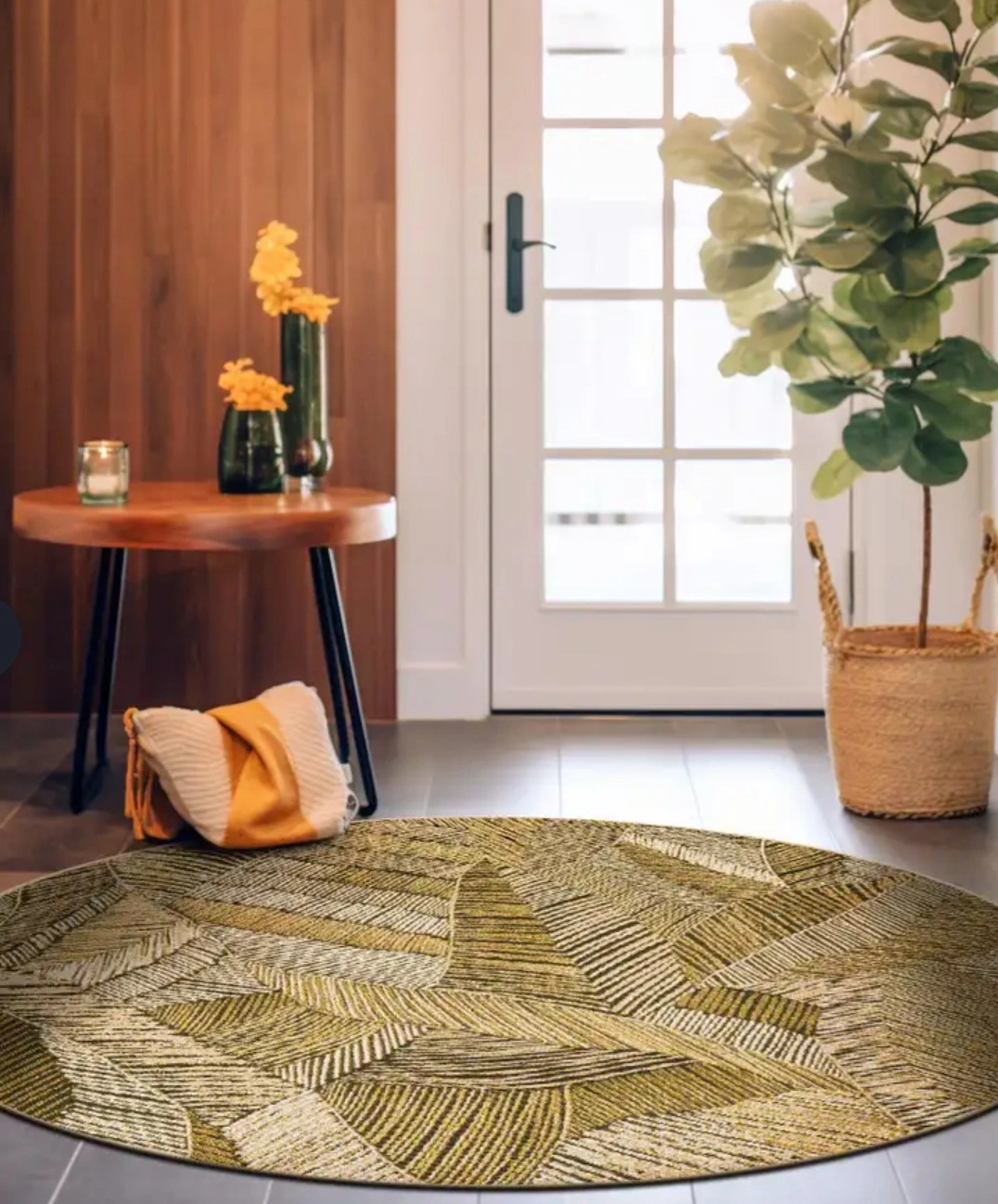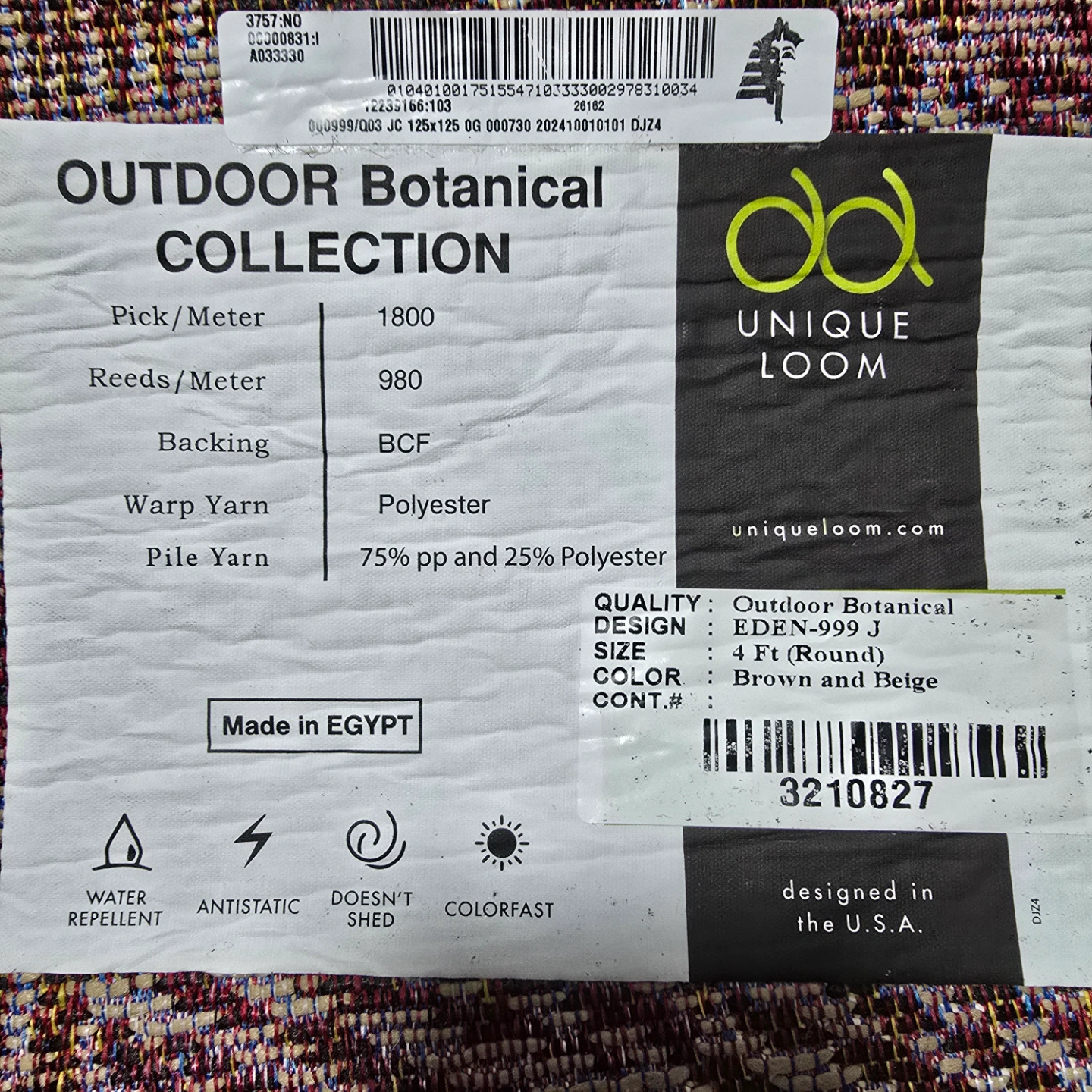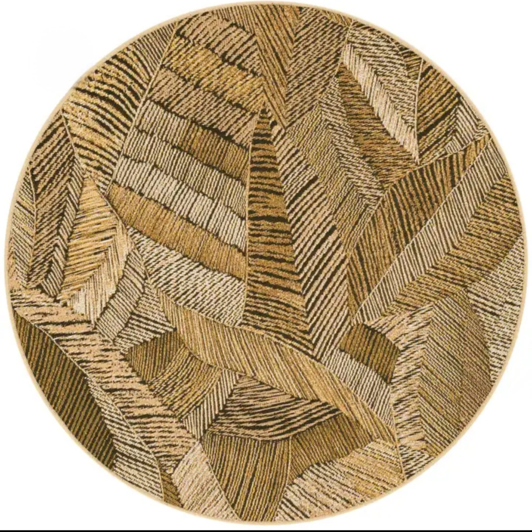 Beautiful round area rug. Features an abstract pattern in shades of beige, brown, and gold. Suitable for indoor or outdoor use. Durable and easy to clean. Brand New, never used.