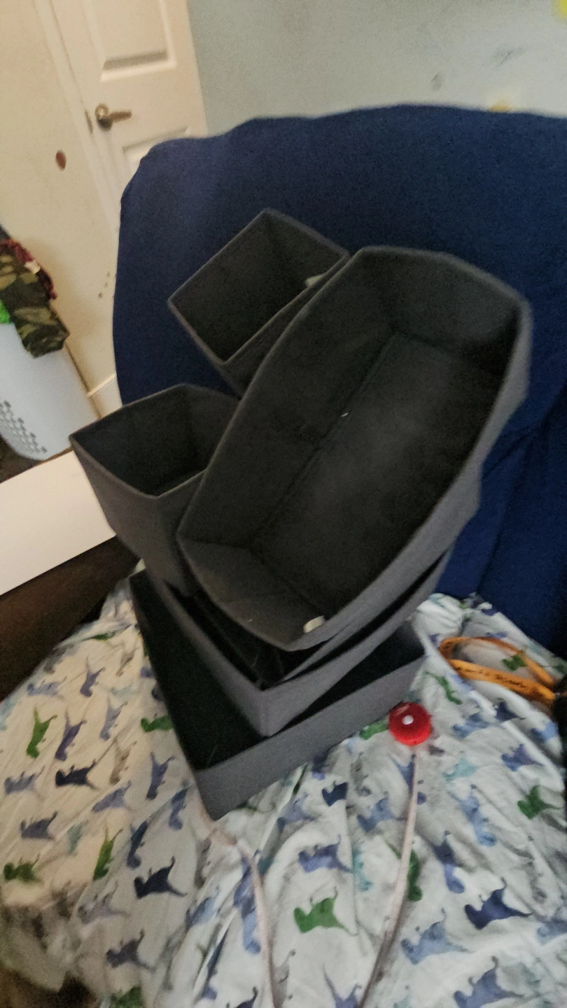 3 large, 1 medium and 2 small grey fabric storage bins, various sizes needs cleaning . Two black plastic storage container like new. Great for organizing closets, drawers, or shelves. pick up only near Adelaide and huron Street. Cash preferred. 10 for all.