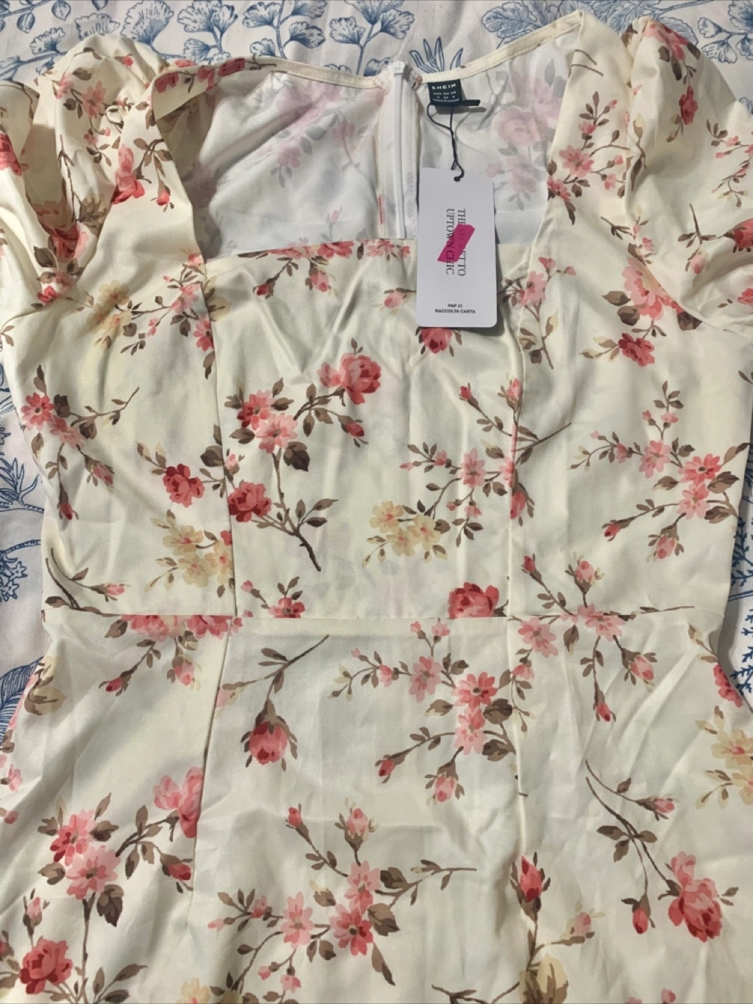 Adorable floral print maxi dress. Features a square neckline and short puff sleeves. Cream coloured base with pink floral pattern. Perfect for spring or summer. Size is small